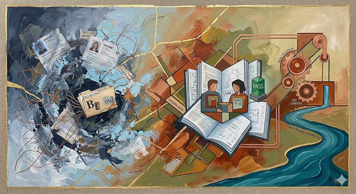 What's different here is that the skills are specific and testable. Derek has Go syntax—he can actually read and write Go, not just talk about it. Barry has AGENTS.md reading—Billy needs him to understand the hierarchy, not just have opinions. Sam has health check—he can audit production and know what he's looking at. That's real work that either gets done right or doesn't.