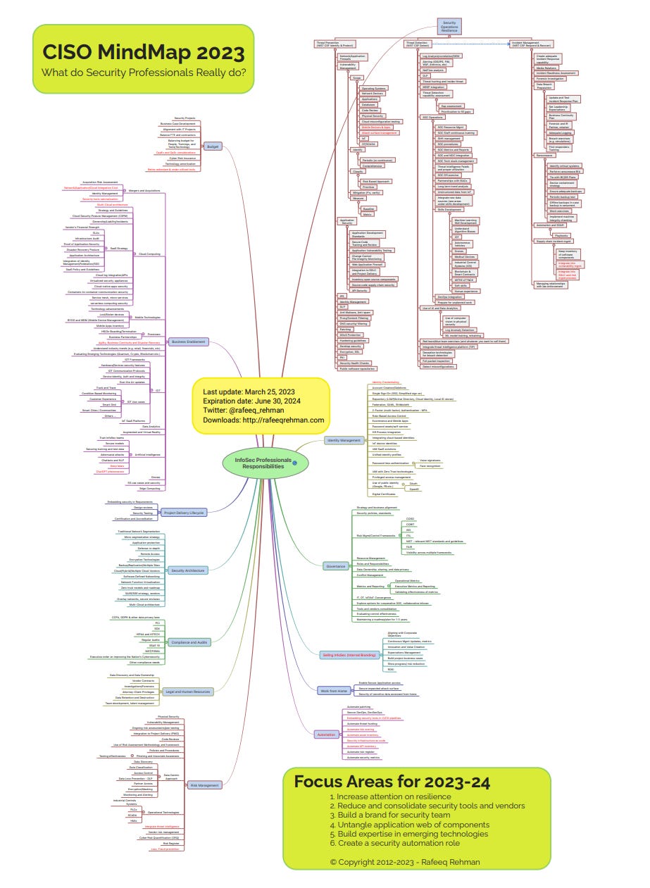 Many outside the Information Security community may not have visibility into all the things that Security Professionals have to be responsible for, think about, and implement every day. Below is an image (with the link to the original, as all props go straight to Rafeeq Rehman for his efforts in building this tremendously useful tool that I use for planning and execution) of a mindmap depicting a very comprehensive view of the various topics that must be considered throughout the year by security professionals in order to build a defense-in-depth posture that is risk-aligned with business goals.