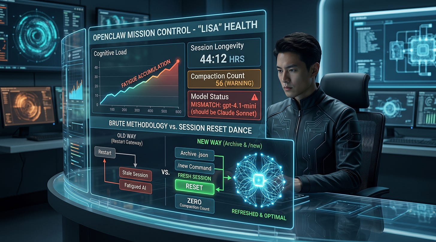 I noticed something off with Lisa after she'd been running for 44 hours straight. The health dashboard on my Openclaw AI Mission Control told me the story pretty clearly. 56 compactions. Wrong model showing up (gpt-4.1-mini instead of Claude Sonnet). Response times slowing down, not dramatically, but noticeably. She was tired, and I didn't even realize it.