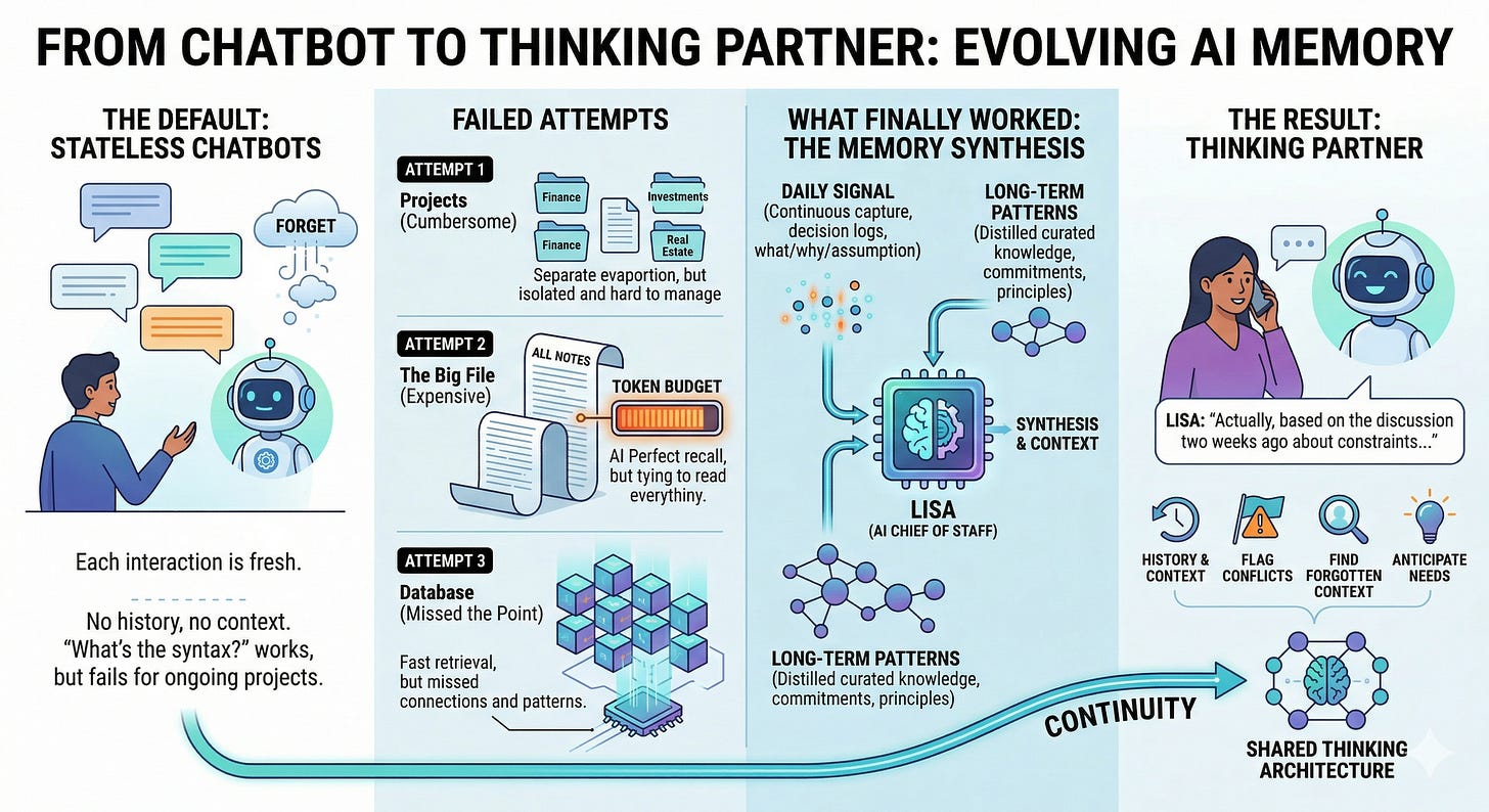 What I actually built that worked, finally, using OpenClaw was this: Lisa (My AI Chief of Staff) captures decisions continuously. Daily notes, not journaling. Decision logs. What was decided? Why? What assumption was made? What was tried? What failed? The logs are structured, dated, and she reads them as part of her normal context window. When something significant happens, she distills those daily logs into curated long-term memory. The patterns. The principles. The commitments that matter. The things that are worth remembering six months from now.