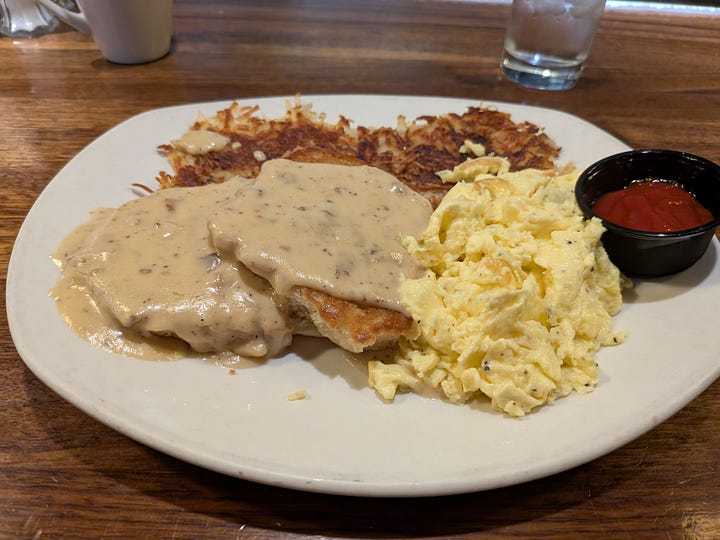 I ordered up what I thought would be a simple biscuits and gravy, but what I got was something else (in a good way). They split their biscuits, butter them, then grill them on the flattop. I’ve never had them done this way, and they come out soft and cloud-like on the inside and a little crispy on the outside, and they have a mouthfeel almost like a well-made pancake. It was truly a unique experience for what is often such a simple and mundane meal.