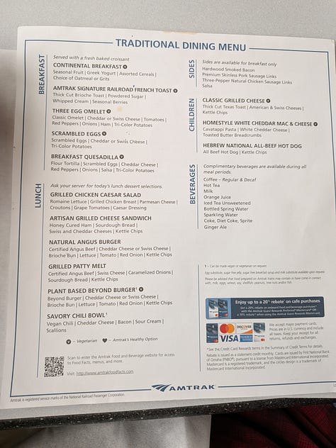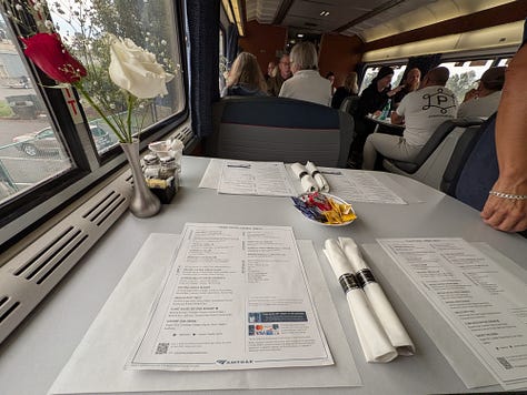 I proceeded to car 1130, then upstairs and down a hallway flanked on both sides by roomettes (the smallest and cheapest private space you can purchase and still have it be a room that holds two people and entitles each rider to meals along the route included). I settled in, logged in and got to work.