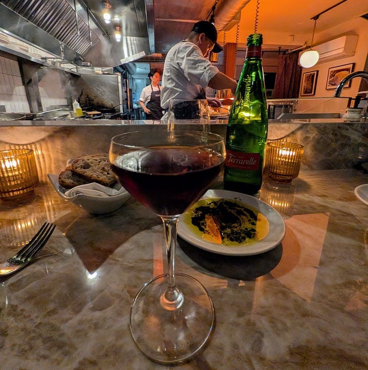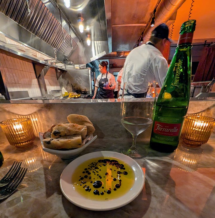 As I browsed the menu, the server brought over house-made bread studded with Castelvetrano olives (my favorite), served alongside a light, bright, sweet, punchy olive oil and balsamic. Add in a bubbly Italian mineral water and a Manhattan made with Rye, Averna Amaro, and a 20-year-old Kopke port, and I was well on my way to bliss.