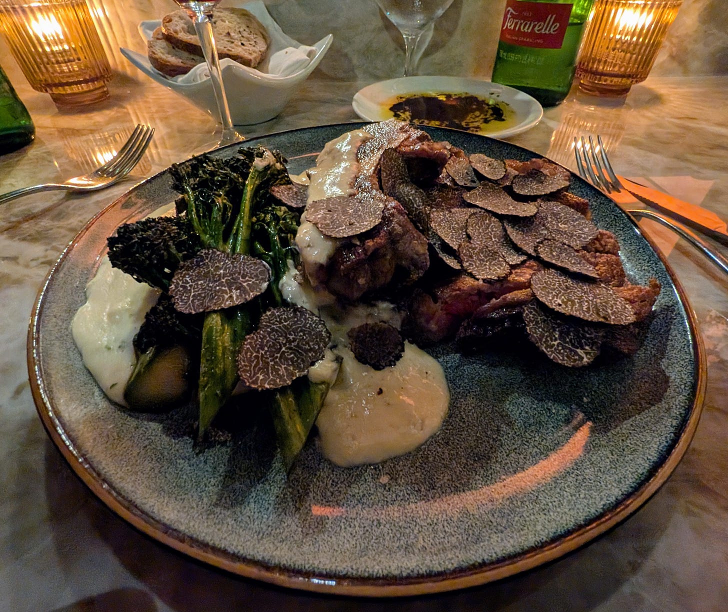 Feeling adventurous, I went all in on the entrée: the 40-day dry-aged ribeye served with a creamy garlic potato purée, perfectly sautéed broccolini, a luxurious black truffle cream sauce, and, because why not, shaved Black Winter Truffles from Burgundy blanketing the plate. This dish was nothing short of extraordinary.