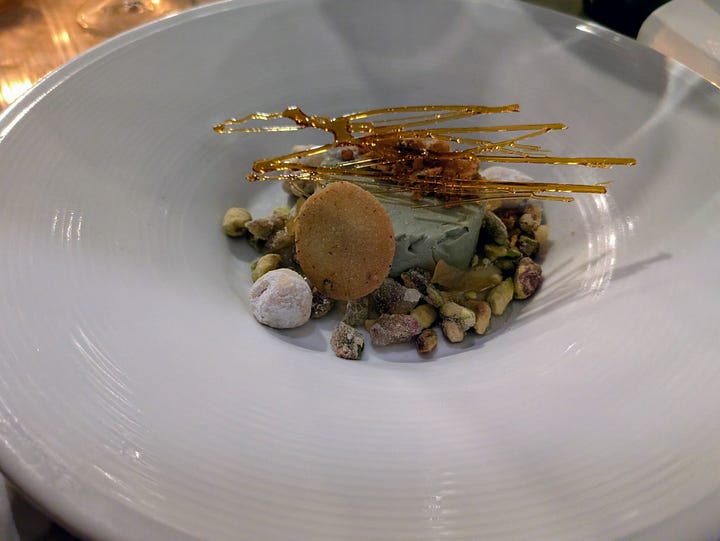 Unable to choose, I followed my server’s brilliant suggestion: order the Pistachio dessert, and she’d bring me a small scoop of the Gianduja gelato on the side.