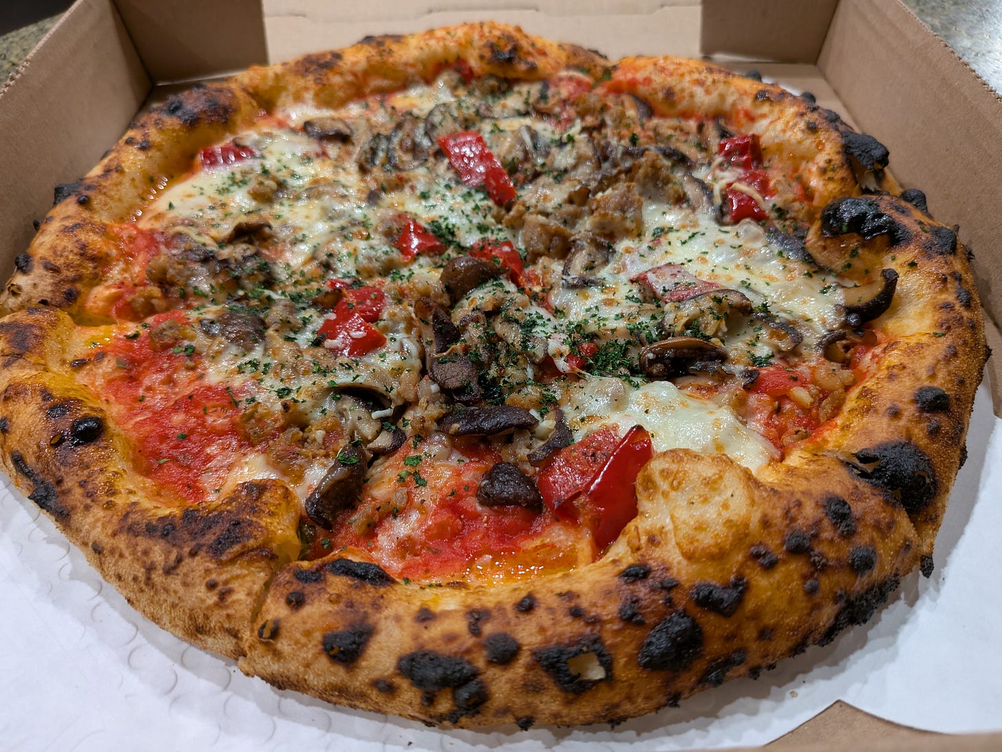 Mucca Osteria sits right next door to Mucca Pizzeria. I didn’t get to try their pizza that night, but while writing this post I needed something to gnosh on, so I ordered the Salsiccia e Funghi, a Neapolitan-style pie with Italian sausage, mushrooms, Mama Lil’s peppers, and mozzarella. It arrived still piping hot after the 8-minute trip from the restaurant to my home. Chewy, beautifully leoparded crust, generous toppings, and the perfect size for a one-person meal.