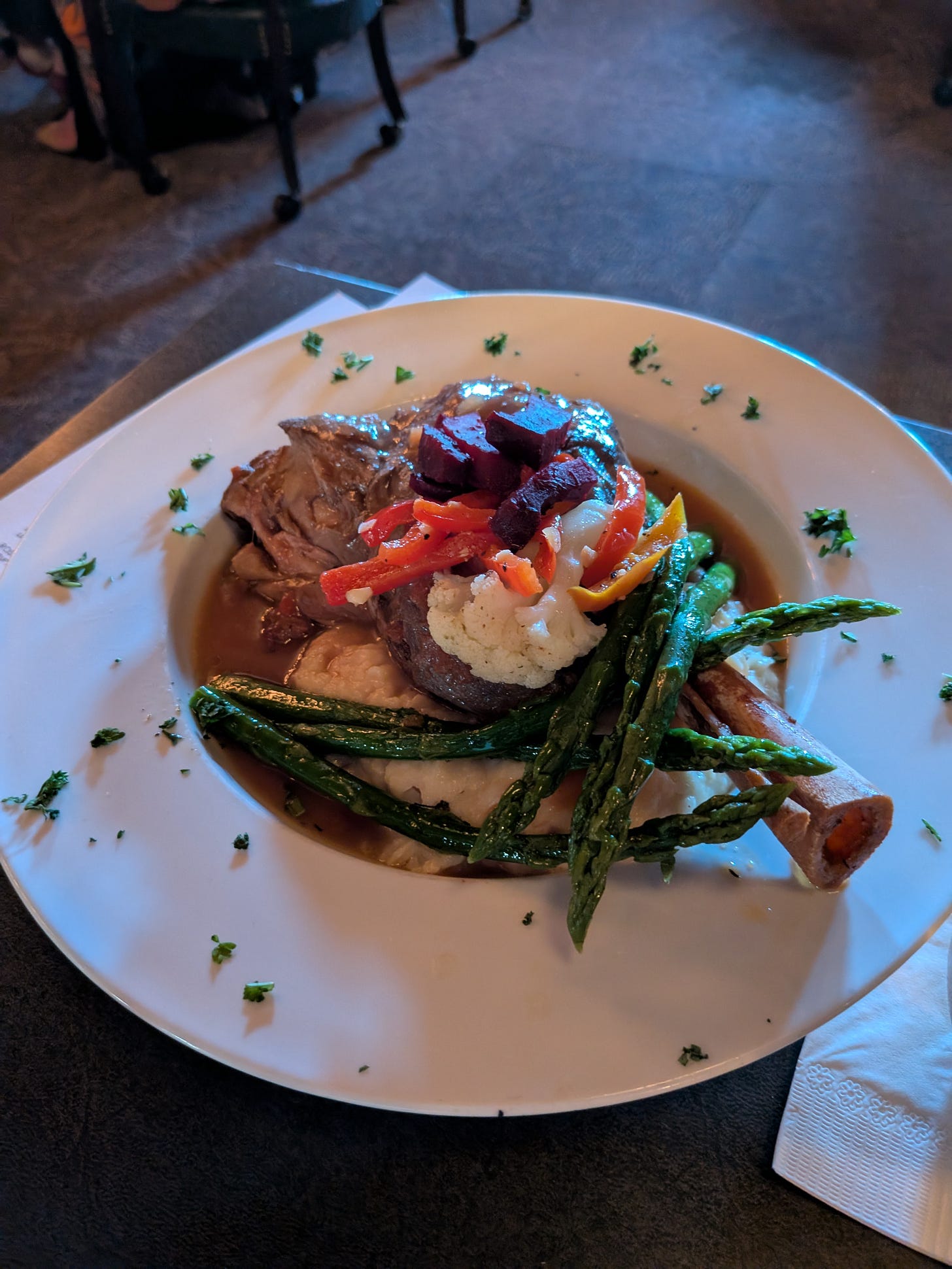 For my second course I ordered up the 8-hr red wine braised lamb shank with herbs, carrots and onions served over a bed of delicious, whipped potatoes and some tasty slightly crisp asparagus on the side. The meat was fall-off-the-bone tender but slightly under seasoned requiring a dip of each fork full of meat into the super tasty jus.