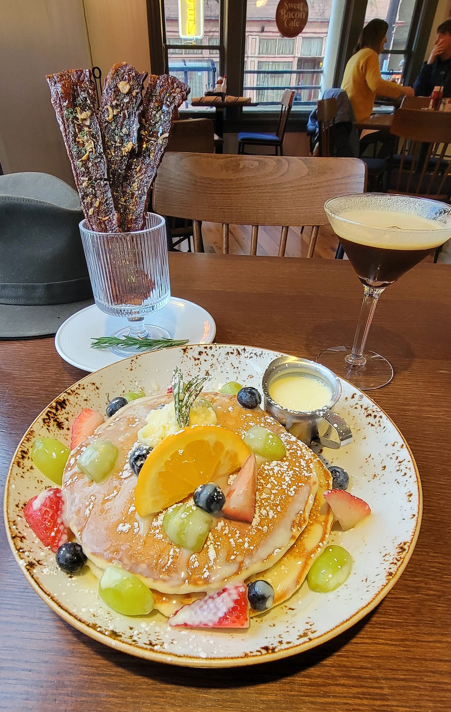 I was the first to arrive at about 0745 and they let me grab a seat by the window even though they hadn’t opened up yet. That gave me time to look over the menu and by the time they opened at 0800 I was ready to order. I started with an espresso martini and decided on the Lemon Creme Anglaise Pancakes with a side of their signature namesake Sweet Bacon; three Palm Sugar-caramelized chunks of crispy bacon seasoned with Tamarind, Thai Chili Flakes, fried shallots and cilantro.
