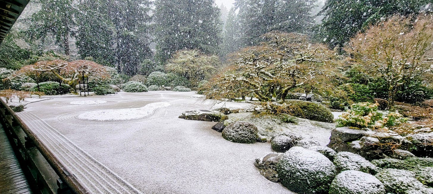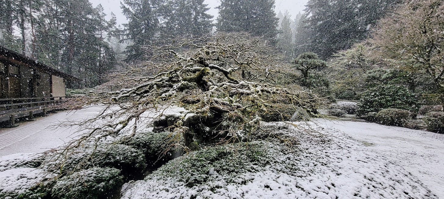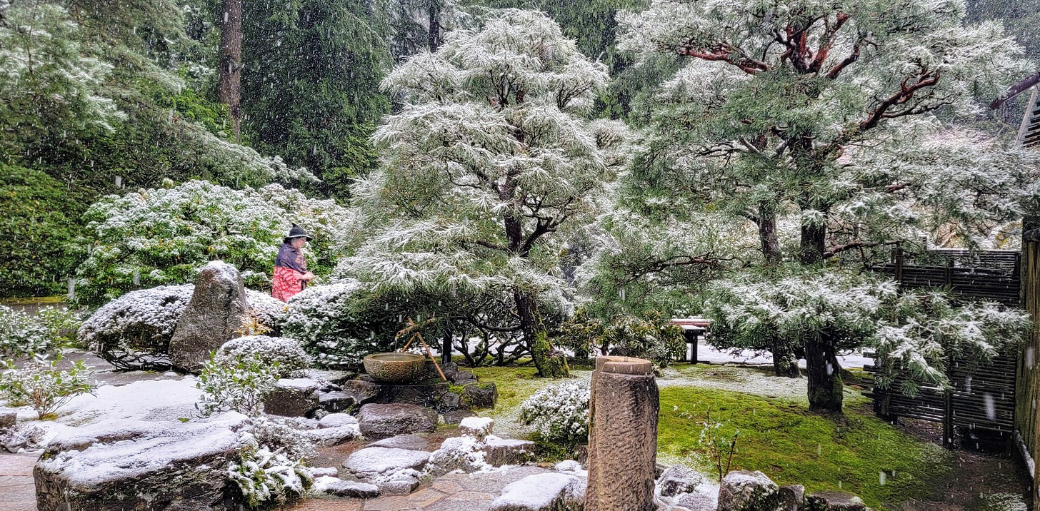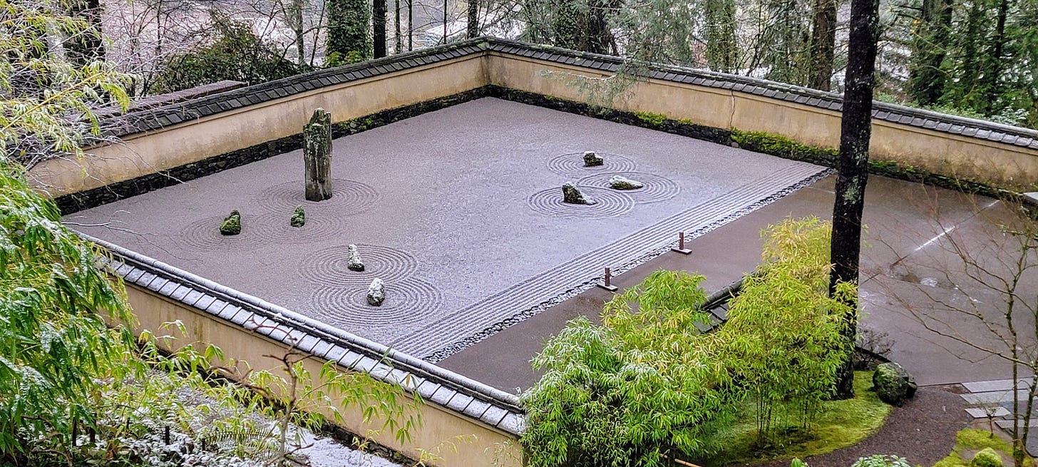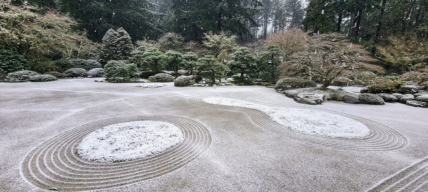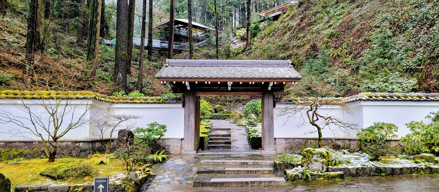 After leisurely enjoying my pancakes, I wrapped up breakfast and got back in the car for the 6–8-minute drive over to Washington Park and my next destination. Washington park (410 acres) reminds me of a smaller (and much nicer) version of Golden Gate Park (1,017 acres). I can’t wait until Spring when the International Rose Test Garden is in full bloom. But today I was headed back to the Portland Japanese Garden. Having a membership there, I have been visiting at least one weekend a month since December 2023, and each time the experience is different.