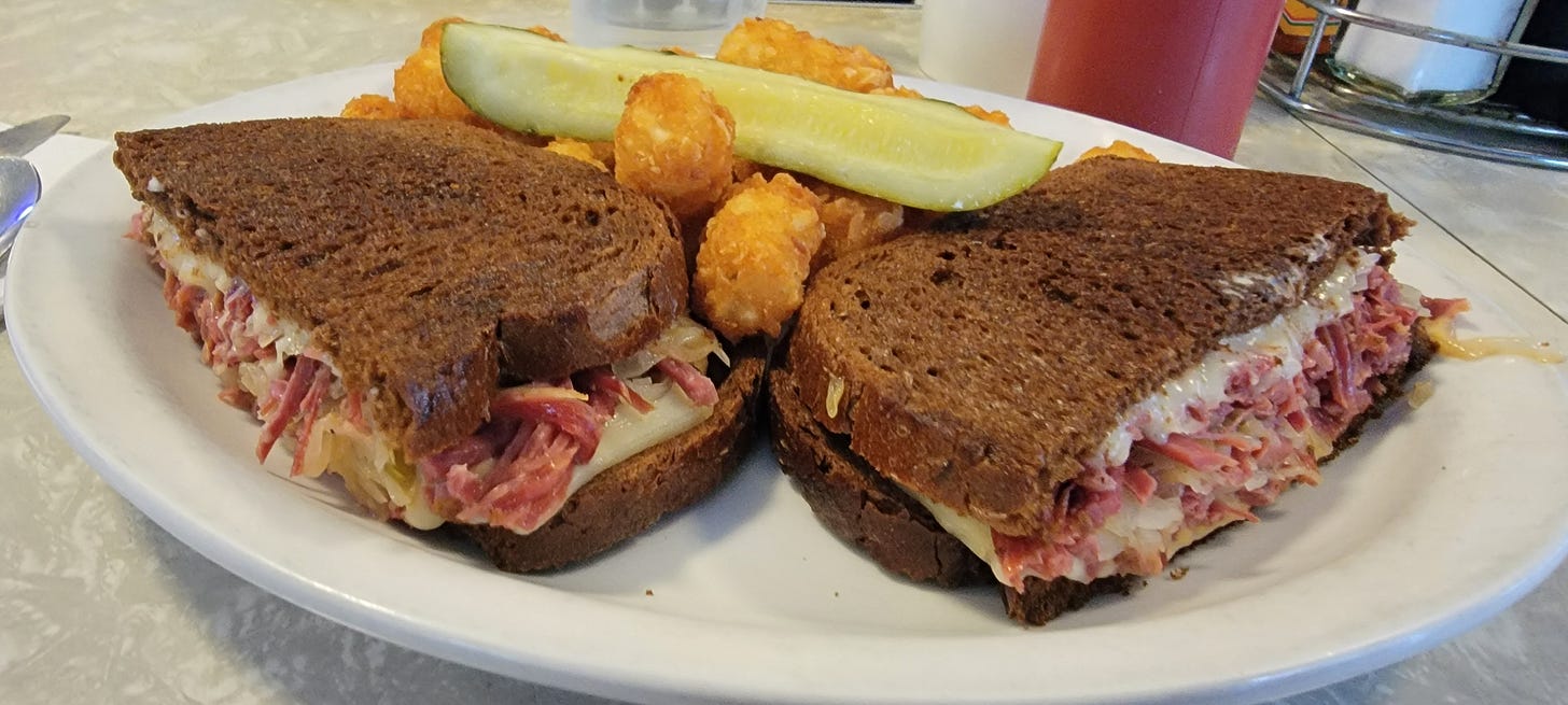 I like my Rye two ways; one mixed into an Old Fashioned cocktail with some Luxardo cherries and the other, combined with Pastrami, sauerkraut and Swiss cheese into a Reuben sandwich with a spear of dill pickle and some crunchy tater tots. This was a perfect specimen of the second.