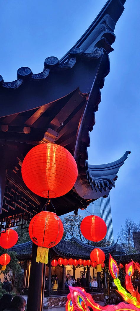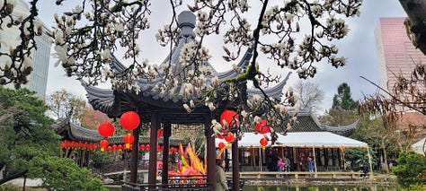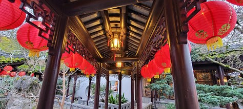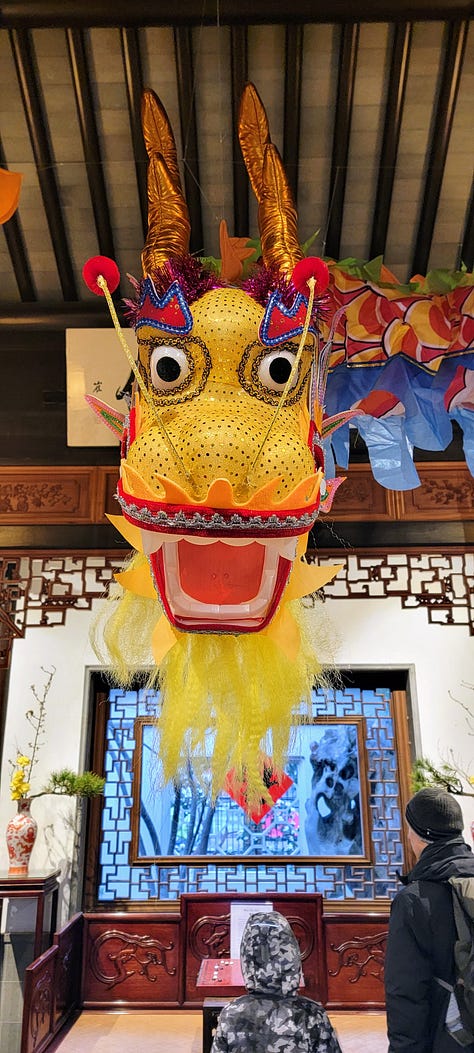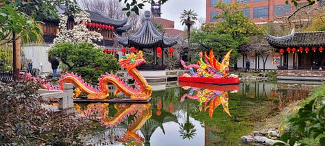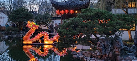 It was nearing 5pm so I headed the 3 blocks back over to the Lan Shu Chinese Garden for the very last day of their Chinese New Year Dragon and Lantern viewing. While the garden is only a single square block, so it can’t remotely compare to the Japanese Garden, it makes up for its lack of size with garishness, color and noise. This was no zen space during my visit (to be fair, this was a special after-hours program, not what is seen during the normal day), but it was beautiful and organized.