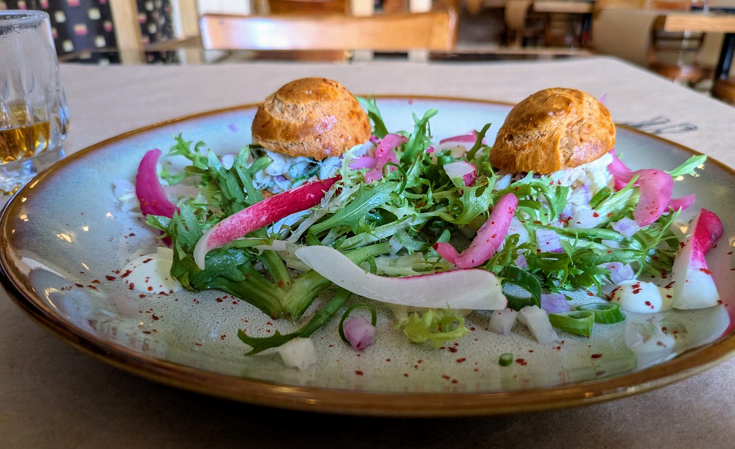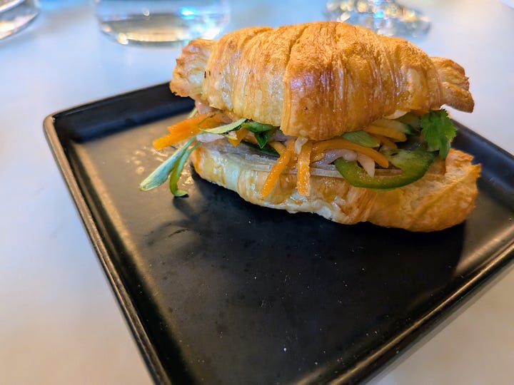 One of the items he rattled off was a Dungeness crab “slider” on a mini croissant with a frisee salad. He made it sound like the sliders were large and that I might not be able to handle three with the other food I was getting so he was willing to cut it down to two… Ok. When the plate arrived I had to laugh, as there were two tiny nubs in a nest of green on the plate. I tried one and the bread was overly crunchy and crackly and it was gone in one bite. It had a hint of crab, but mostly it was sandwiched in wet chopped up daikon and other veggies. I ate the second, and set the plate aside completely unimpressed.