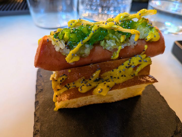 During Happy Hour they have great drink and food specials, and I had to start out with a One of These Nights, which is made with chai-infused George Dickel Rye, mango juice and sweet vermouth. It is addicting to say the least, and had I stayed longer I could have easily gone another round. To go along with my cocktail I decided to get a couple finger sandwiches, settling on two (The pictures were taken up close. The sandwiches are really only about 2 inches long at most). The first was the Croissant Banh Mi, made with Viet pork, pickled carrot, cilantro and jalapeno. The second was The American Dream, a mini-Chicago dog covered in fresh onions, relish and mustard on a sweet roll. Just a little something to soak up the elixir.
