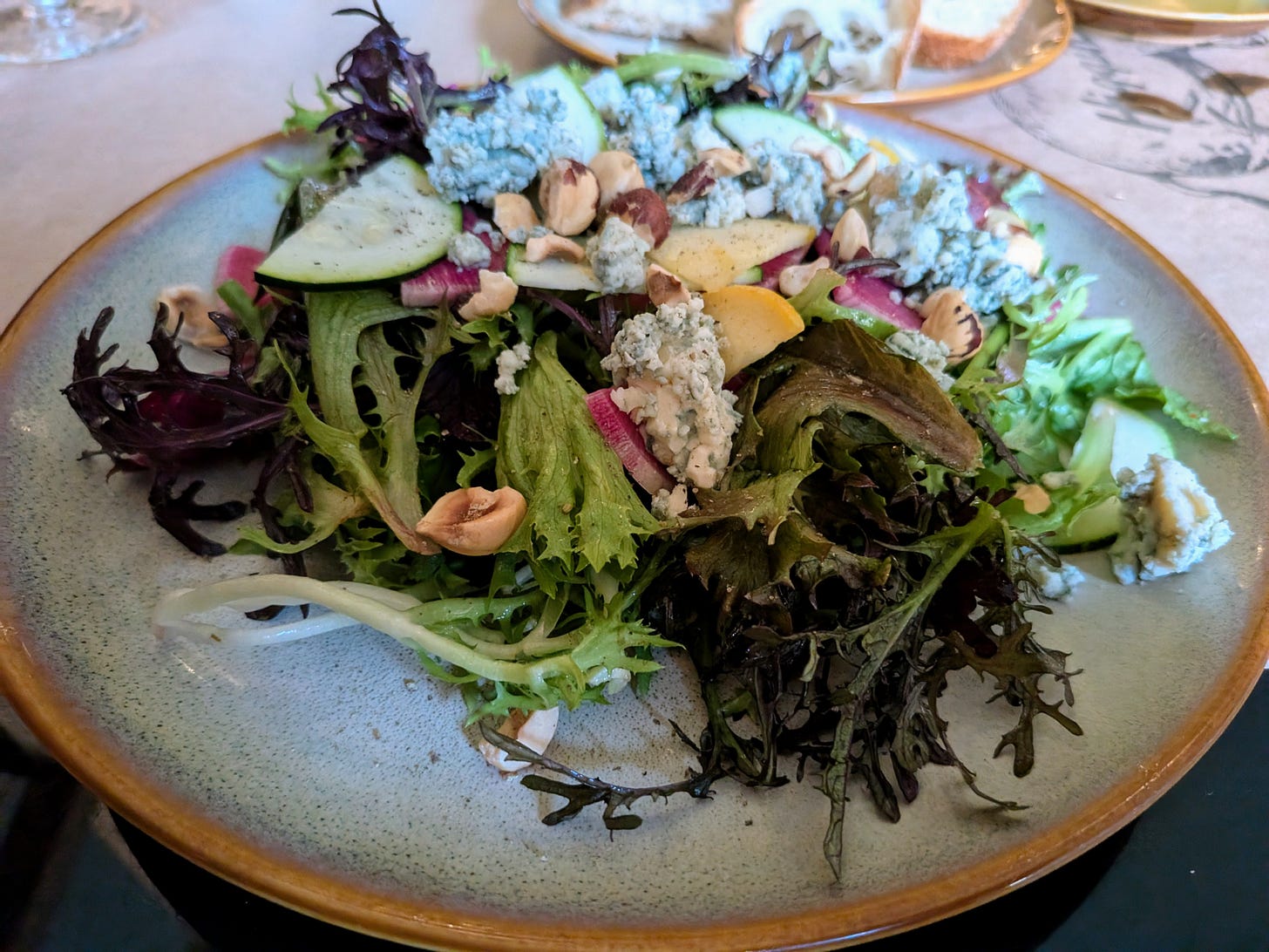 Next up was a small salad with dressed greens and blue cheese crumbles. I took a bite and immediately thought I was being Punk’d by the chef after my previous comment. The balsamic dressing was so overpowered by salt that it was barely edible (In the end I only ate about half the salad).