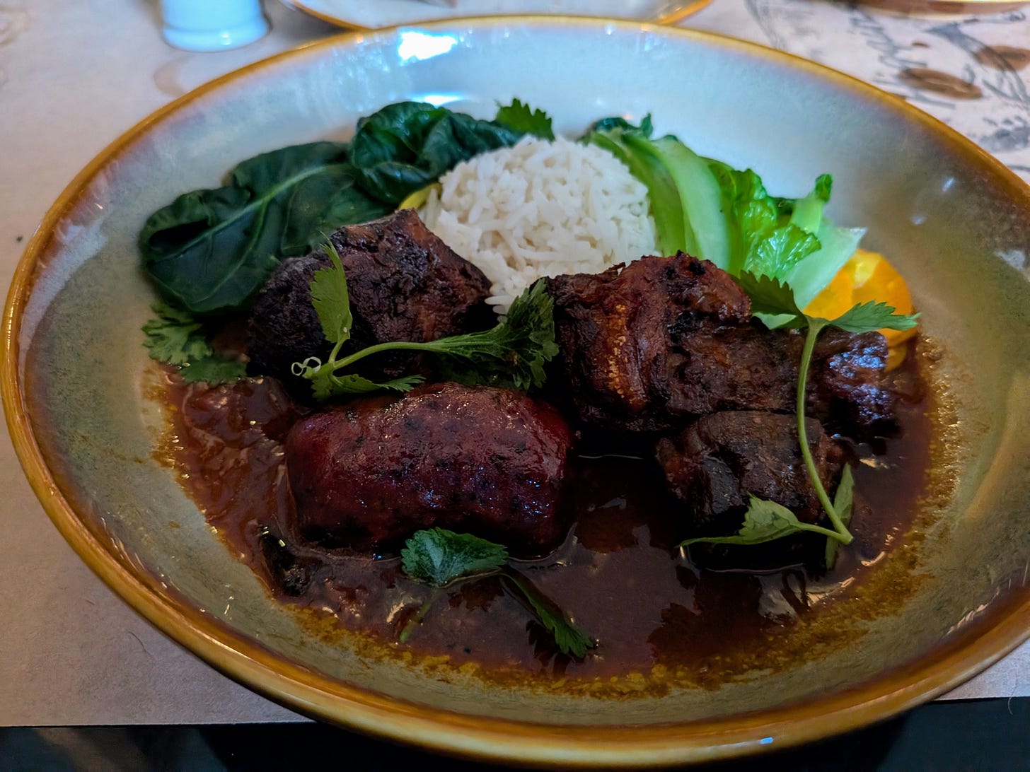 It’s a nice modern outfitted restaurant designed in a split-level format inside an old downtown Portland building (I think we’re at the point now where we don’t really need to make the distinction that the building is old, as pretty much everything in Portland is vintage, in a good way). I was the first one in for dinner service and was quickly seated by the window. I had seen the menu online and pretty much already knew what I wanted, but the waiter was proud of the specials and wanted me to hear them all. I must say that I was intrigued and as I’ll mention later, it’s likely that I’ll have a chance at a future time to try other things on the menu, but today I had my heart set on the Filipino Braised Pork Shoulder and Belly Adobo with longganisa sausage, atchara pickles, choy and basmati rice.