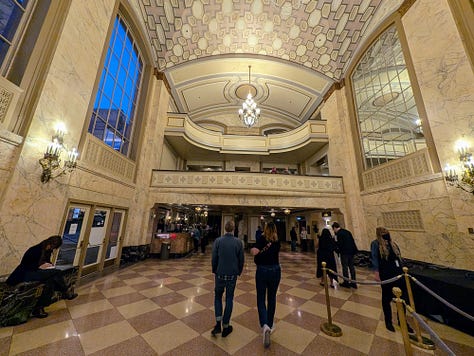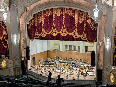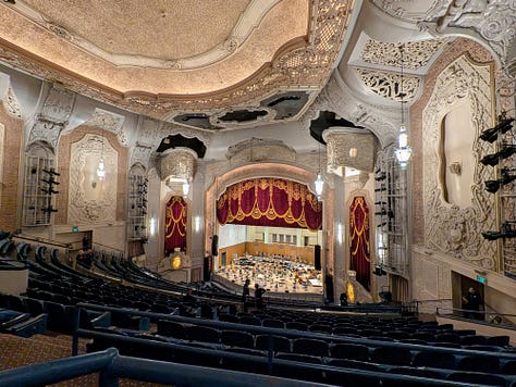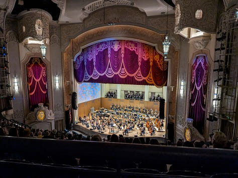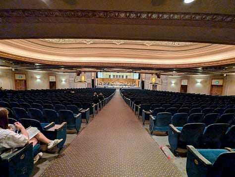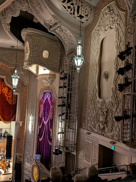 The concert lasted about 2 1/2 hours with a 15–20-minute intermission. The theater has great acoustics, but I would definitely not want to sit on the bottom level as I don’t think that the grandness of the theater comes through with that roof being so low. I also learned a lesson not to sit in the first row of a section as the theater was built when men were 5’6” and weighed 140 pounds and the half wall is very constricting. It was worse than sitting in the first row of economy plus with the wall right in front of your face and no place to put your feet. Eventually I moved back a row so I could stretch my feet, as the entire lower balcony was empty.