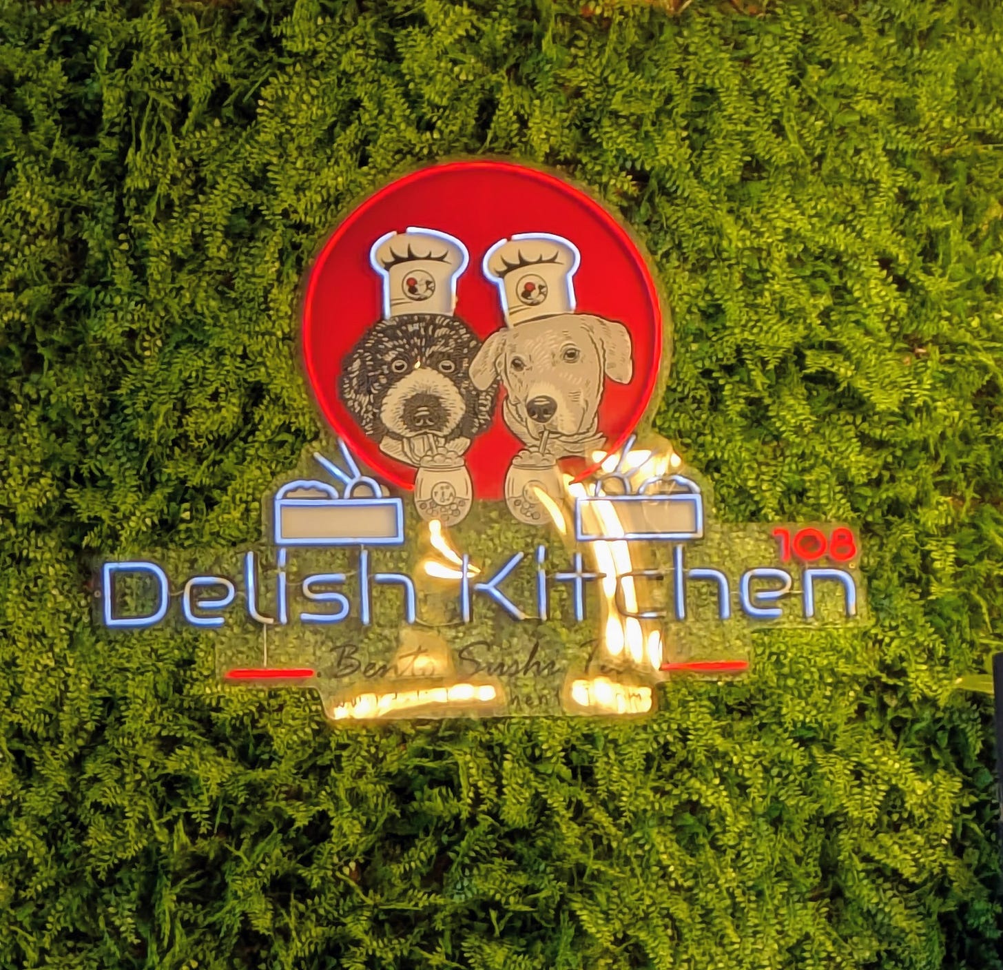 Five or Six tables. Hanging plants. Chill lo-fi music floating through the speakers. A moss wall with a neon sign of two cartoon dogs wearing chef hats.