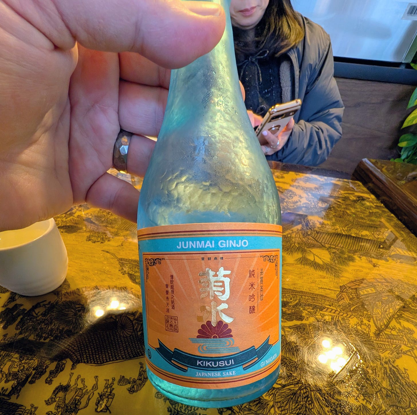 Kay poured for me. I poured for her. That’s the rule (even though she’s not big on alcohol, she enjoyed a small cup).
