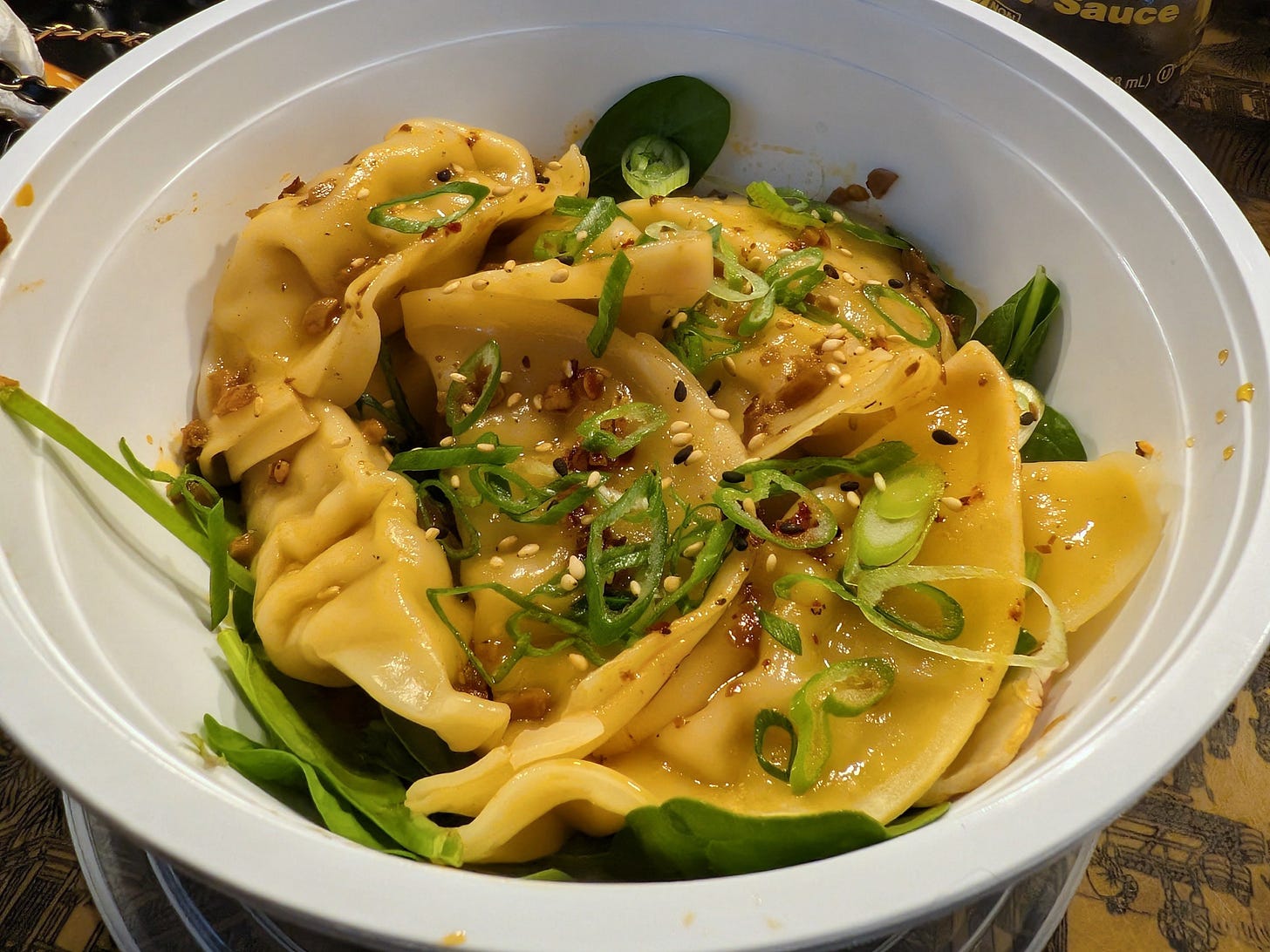 The wrappers are thin and silky. The pork filling has real flavor without being heavy. And the garlic flavor arrives slowly, building warmth at the back of your throat.