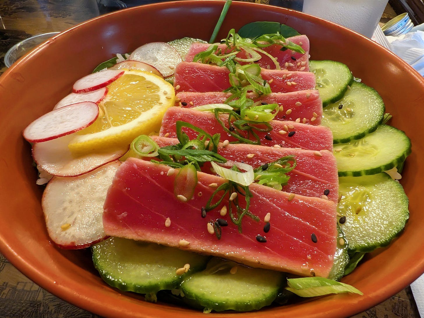 Six thick slices of lightly seared tuna, still deeply pink in the center, fanned across cucumber rounds, radish, and a mound of fresh spinach marinating in the house’s special sauce, topped with sesame seeds, scallion curls and a wedge of lemon on the side for some acid.