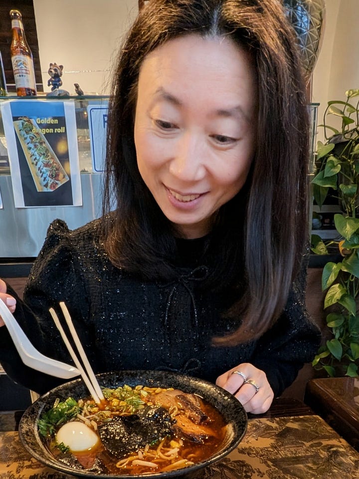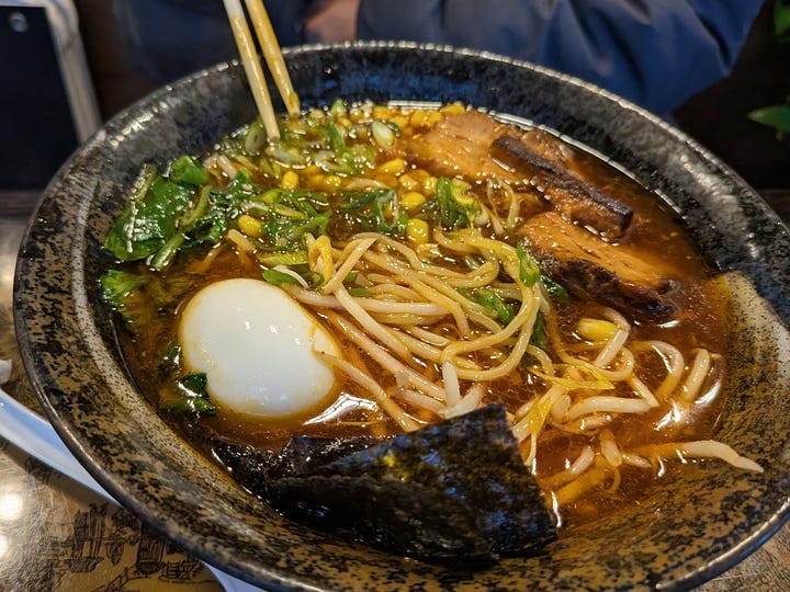 Kay ordered the shoyu ramen, and when it arrived it looked composed. A rich amber broth with thick slabs of braised pork belly with caramelized edges. A soft-boiled egg with a jammy center on the side and sweet corn, bean sprouts, dark sheets of nori, and noodles tucked underneath everything.