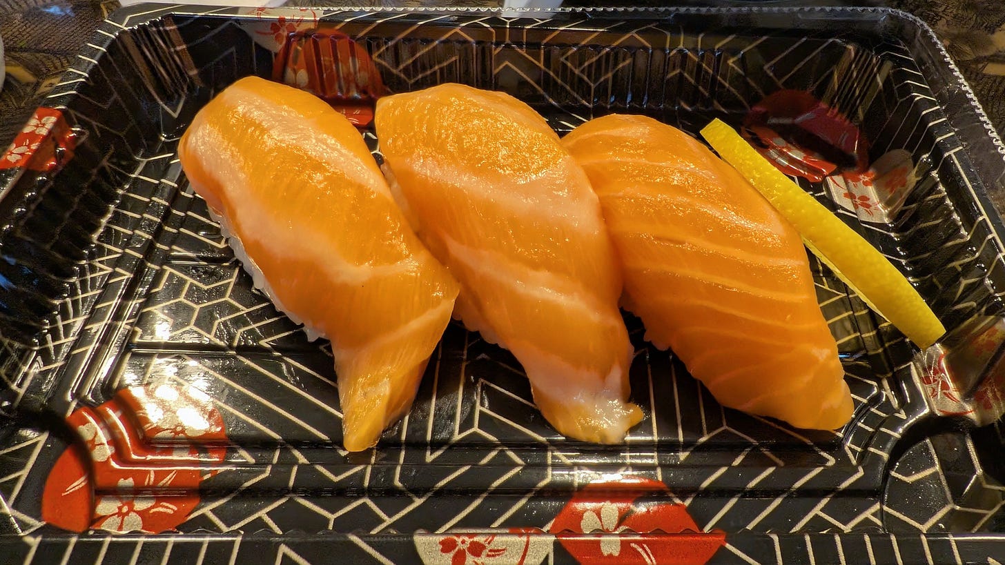 If you’re sitting next to a sushi counter, not ordering nigiri feels like ignoring the obvious, so we ordered up some salmon belly. A normal order is two pieces, but after chatting it up with the owner he decided to grace us with a third piece of thick cut fatty salmon draped over rice that was properly seasoned and still slightly warm. Clean. Buttery. No unnecessary flourishes. Kay got two and I savored one with a little soy sauce and “wasabi”.