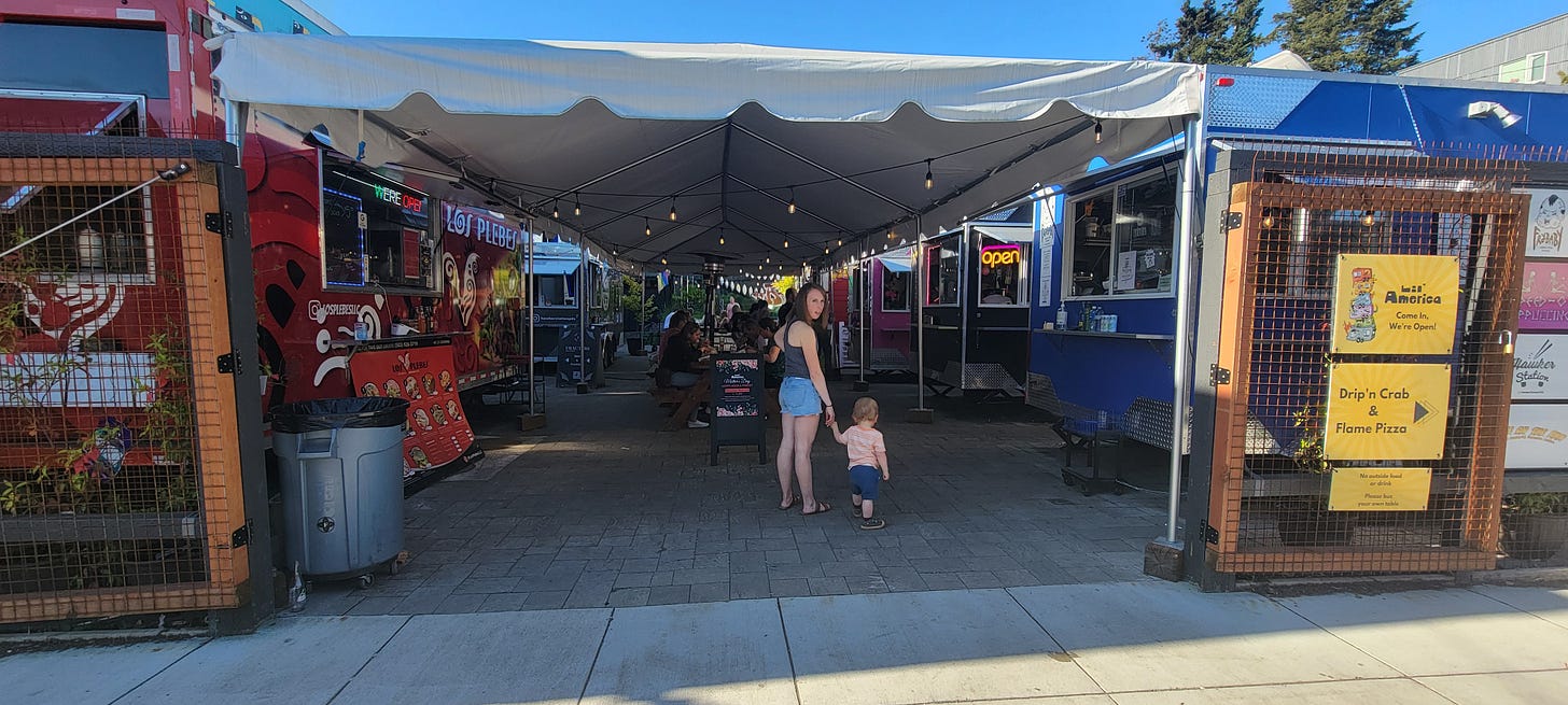 Lil’ America’s eight food carts are located around a central courtyard with picnic tables and raised covered areas at the back with seating for probably about 60-80 people throughout.