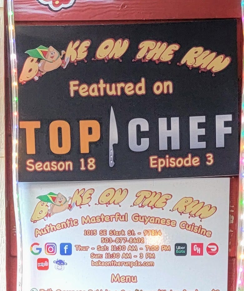 Now that I had indulged in a couple appetizers, I needed to start looking for a main dish, and I was deciding between Mexican or Guyanese. I had briefly seen the sign for Bake on the Run during my initial survey, but I wasn’t sure if it was a gimmick or what (Interestingly, this Top Chef episode shown below featured food from the African diaspora and chef Gregory Gourdet, who is now the owner of Kann, a Portland 2024 James Beard finalist, that I was considering eating at when I decided to go with the food cart. It turns out the contestants visited with Bake on the Run prior to their cook to gain inspiration around African cooking).