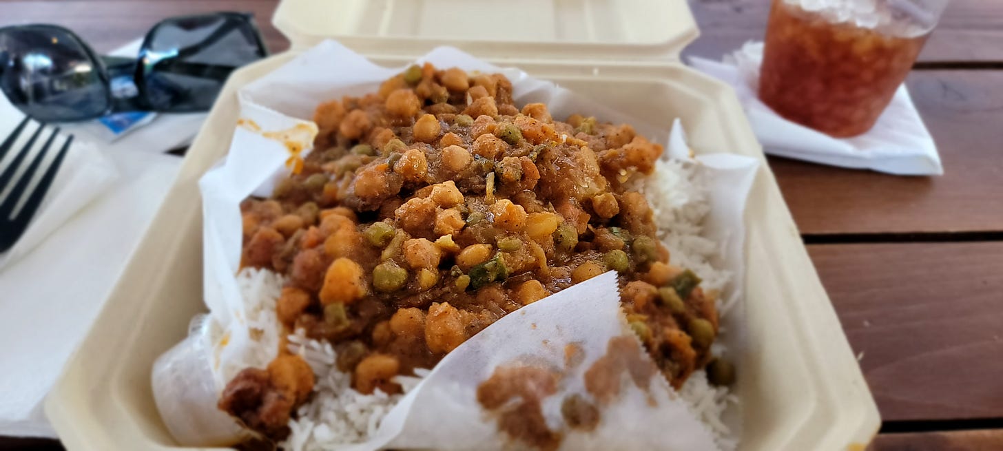 I landed on Guyanese Chana, a vegetable dish with tender boiled chickpeas and potatoes marinated in a tomato-based curry that included scallions, onions, carrots, “magic and love” as they say. It reminded me of Korma, which is probably my favorite Indian vegetarian dish.