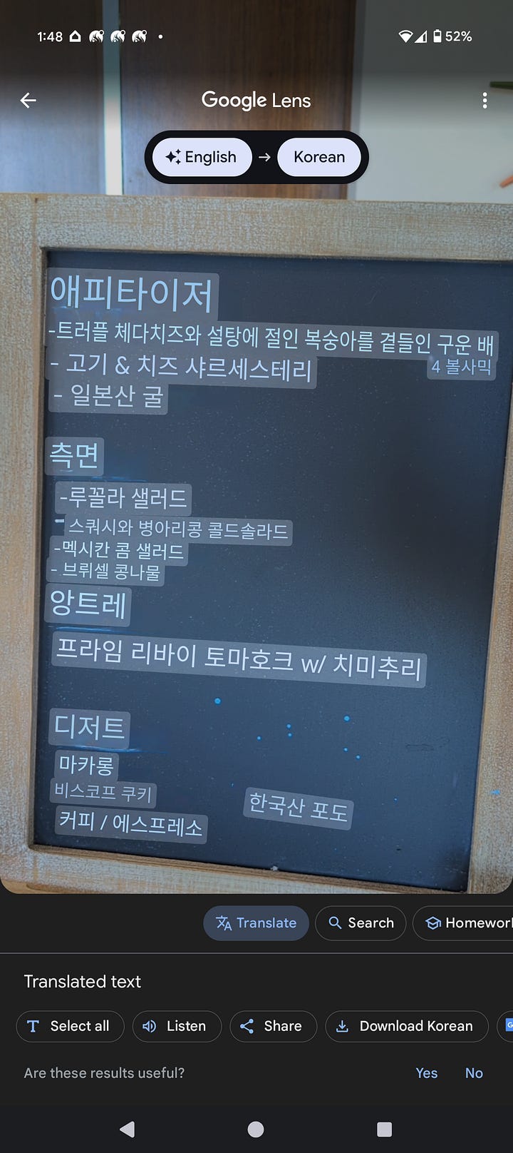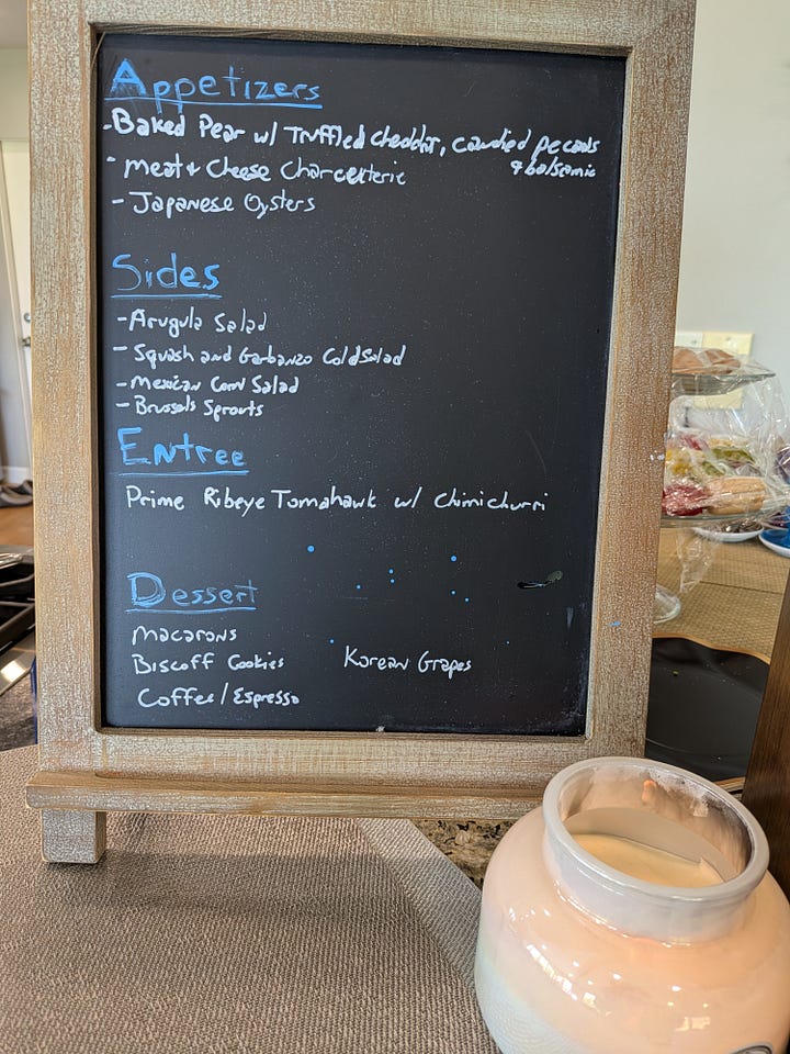 I put together a little signboard with the menu (if you can read my horrible handwriting) consisting of some appetizers, some sides, a main entree and dessert. I used Google Lens to have it translate to Korean as well (that image was only on the camera and didn’t exist IRL).