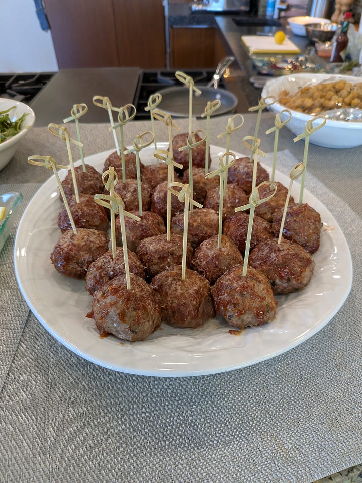 Along with the meat and cheese platter, I roasted some Bartlett pears, then melted some Truffled White Cheddar over them, topped with candied pecans and drizzled with a little honey and some Extravecchio Balsamic Vinegar that is just money. Next up were some BBQ glazed Italian Meatballs with microplaned Manchego that melted into the sauce and added a little creaminess and saltiness. Finally, two dozen Japanese oysters on ice with a champagne and shallot mignonette topped with a small drop of smoked chipotle Tobasco. We don’t have a lot of parties so our plateware isn’t exactly the best, but what we put on the plates is all that matters, and everyone seemed to really enjoy the starters.