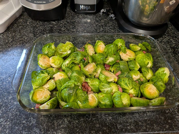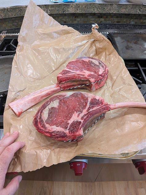 The Tomahawk was served up with some Brussels Sprouts sprinkled with crispy pancetta and balsamic (picture is before the final cook), an arugula and candied pecan salad, a garbanzo and squash cold salad and a Mexican street corn salad (the last two I didn’t prepare, but rather picked up from Zupan’s deli). Oh, I also roasted some baby fingerling potatoes with some French sea salt, but didn’t get a picture.