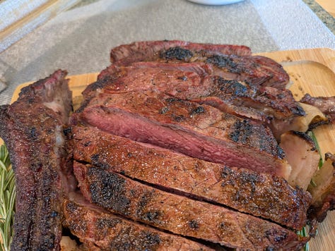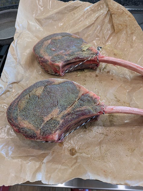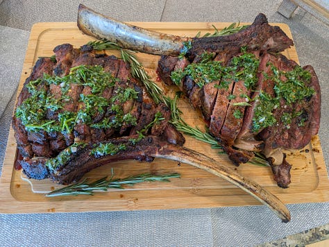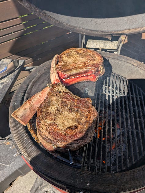 Next up I prepared the entree…six pounds of prime Rib Eye Tomahawk. I seasoned them up with the standard salt, pepper, garlic (SPG), then also added a little Raspberry Chipotle rub that I have that gives it a little color and some pop. While the group was inside listening to the pastor’s talk, I headed out on a beautiful Portland afternoon to throw down some meat on my 600-degree Kamado Joe. After about 25 minutes I had 127-degree steaks ready to rest and come up to a perfect 135-degree medium-rare temperature.