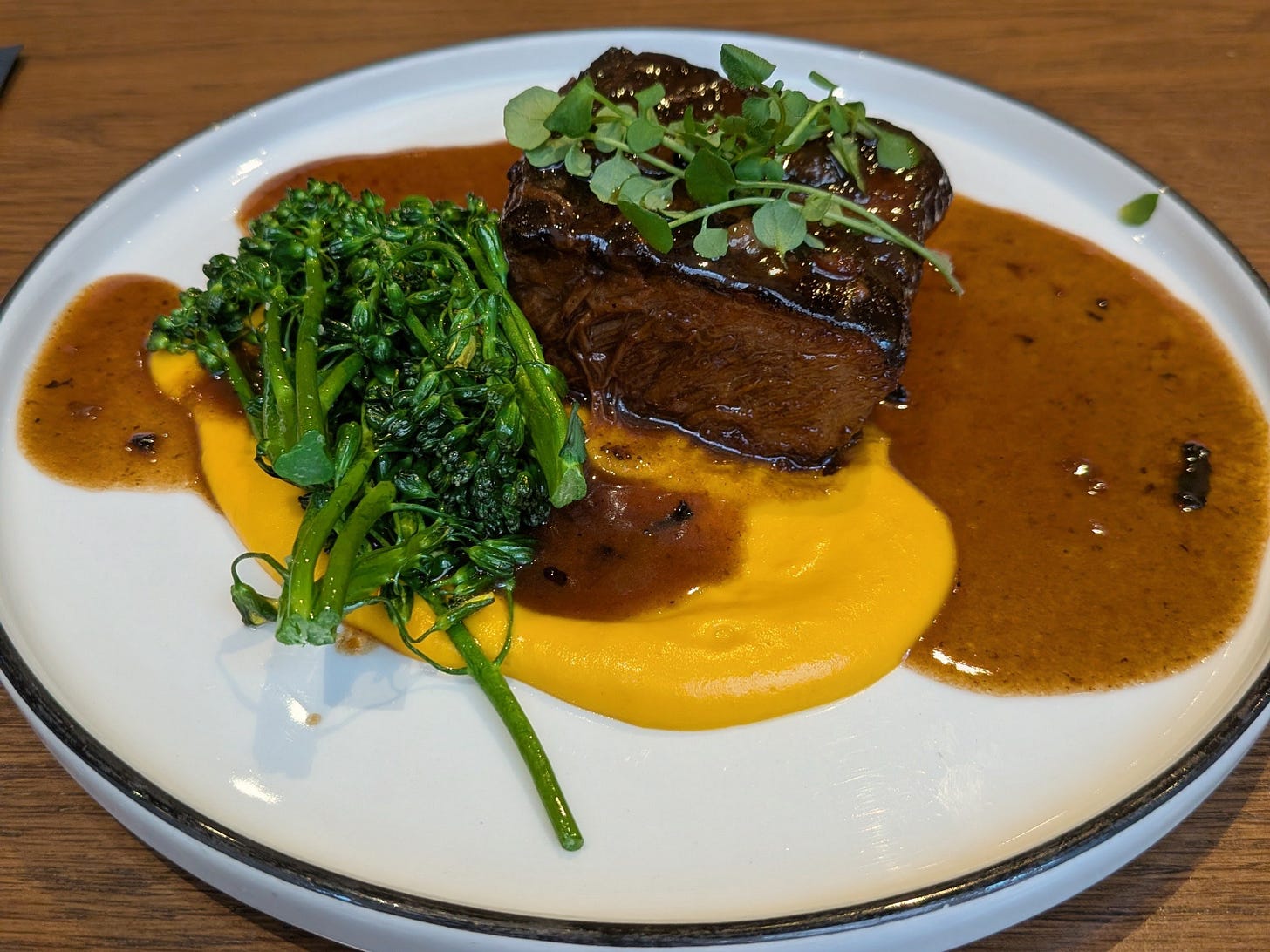 When the short ribs arrived, I will admit my first reaction was surprise both at the beauty and vibrant color of the plate, but also a bit of disappointment at the portion size. It looked modest on the plate, slow braised beef set over a silky carrot purée with grilled broccolini on the side. But that initial impression disappeared quickly. The meat was impossibly rich, tender and deeply flavored from the Guinness slow braise. I asked the waitress for a knife and she told me, “You won’t need it, it’s going to melt under your fork and in your mouth”. I responded, “I hope so. But I will still need to cut the Broccolini”.