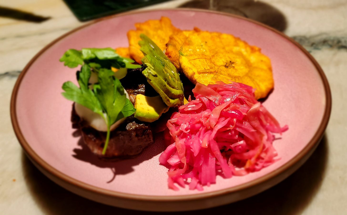 The food came out when each dish was ready, so as I was finishing up the buns the next dish arrived, something many may be familiar with if they’ve visited the Kann homepage above. The Griyo Twice Cooked Pork comes with some slices of avocado, cilantro, pickled onion and four bannann peze (think crispy fried plantain mini tostadas).