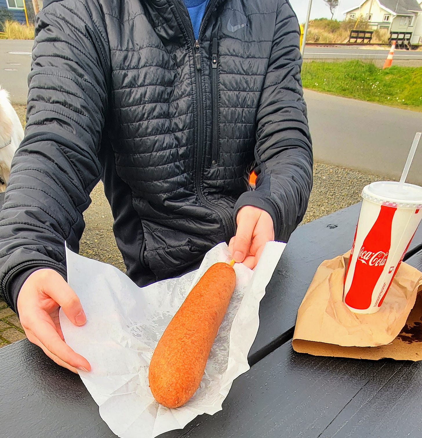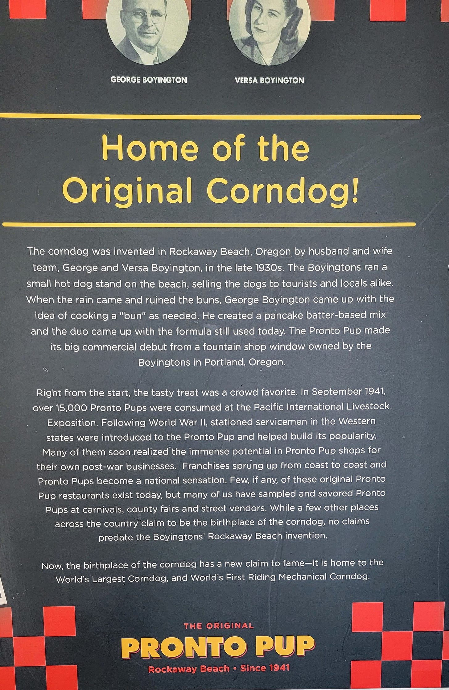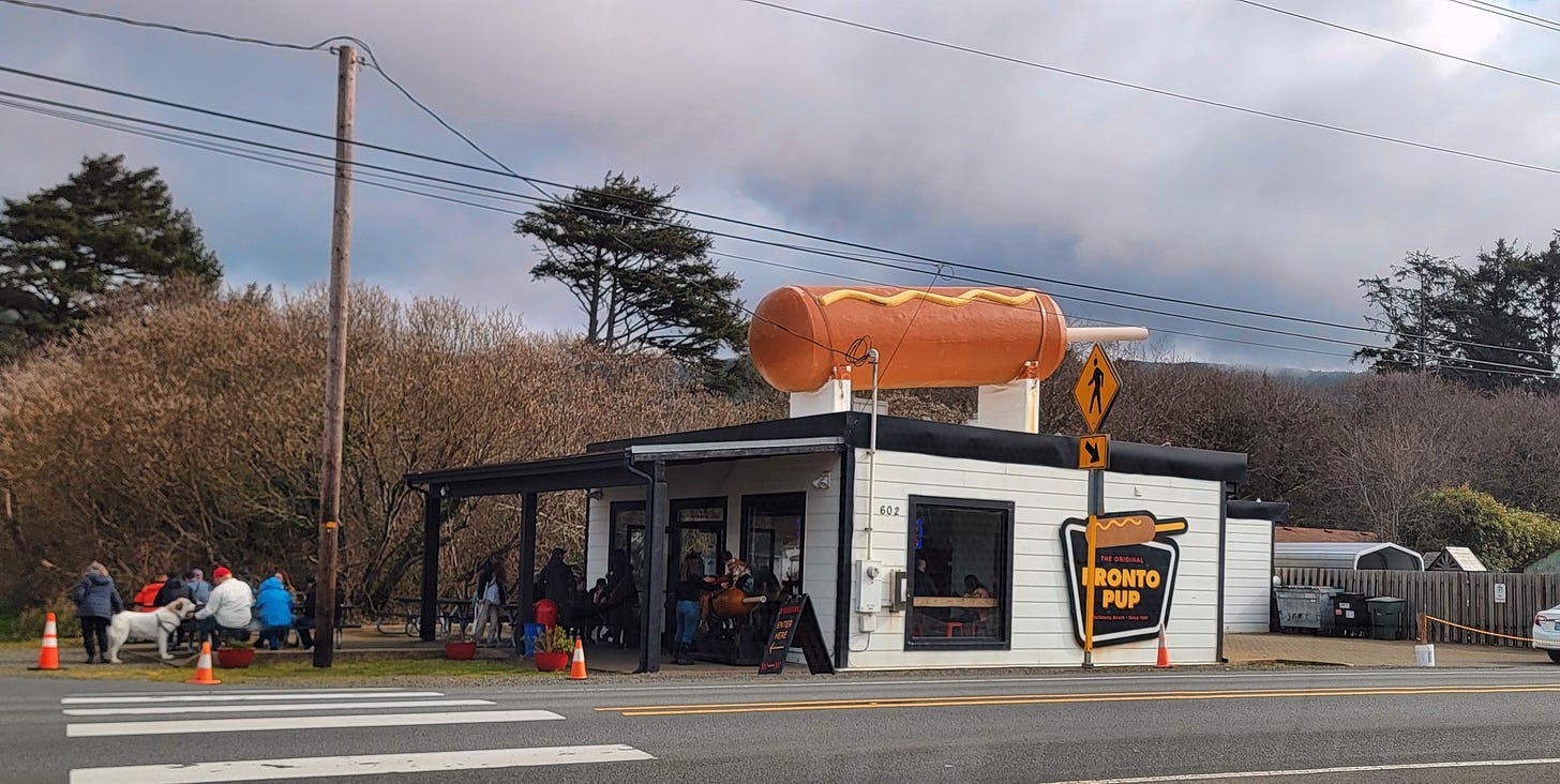 On the way to Twin Rocks I passed up the Original Pronto Pup, the world’s first corn dog franchise established in the 1930s. I kept going as I headed south to Twin Rocks, but after wrapping up there I just couldn’t get that GIANT corndog (looks like it’s made from a large propane tank painted orangish/brown) on top of the building out of my mind, so I doubled back 5 minutes and stopped in.