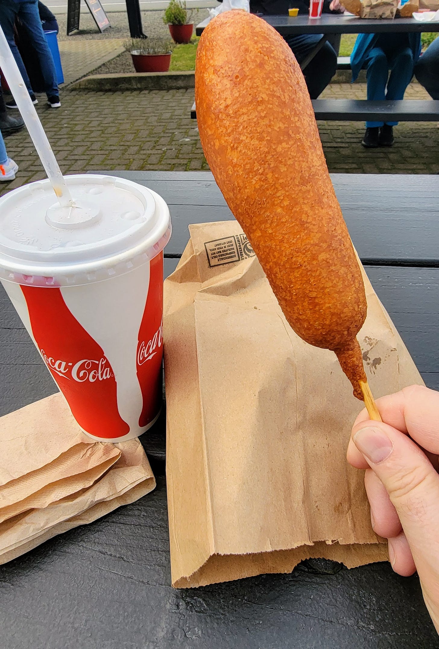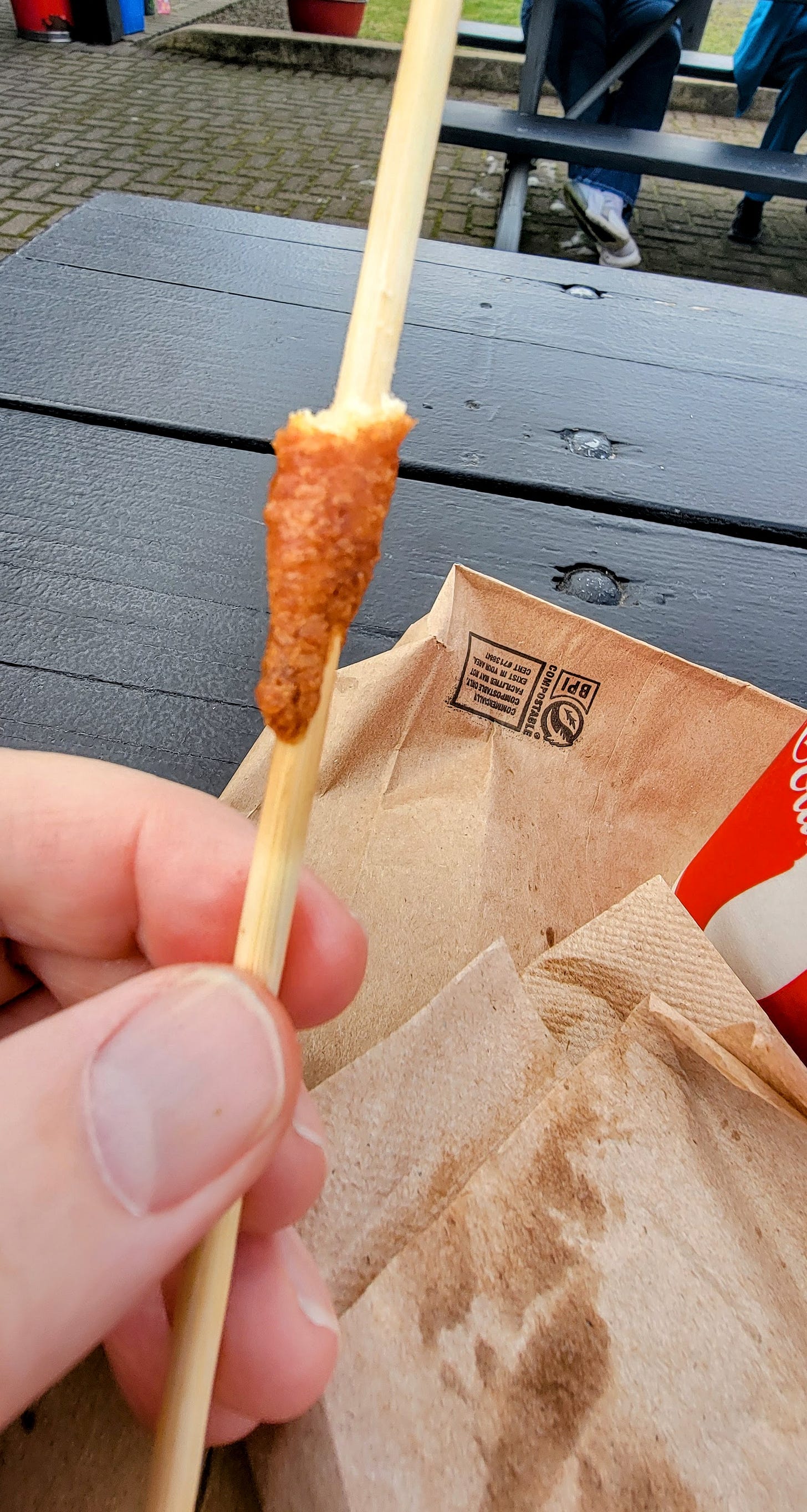 I devoured the whole thing, except for the very last bite. Now, I will say, the sausage itself and the batter on the dog were outstanding, but for any connoisseur of corndogs, let me ask you, aside from maybe the last bite of an ice cream cone that has that solid chunk of chocolate in the bottom, is there anything that compares to that last little crispy bite of corn dog batter that gets stuck to the stick? I think not.