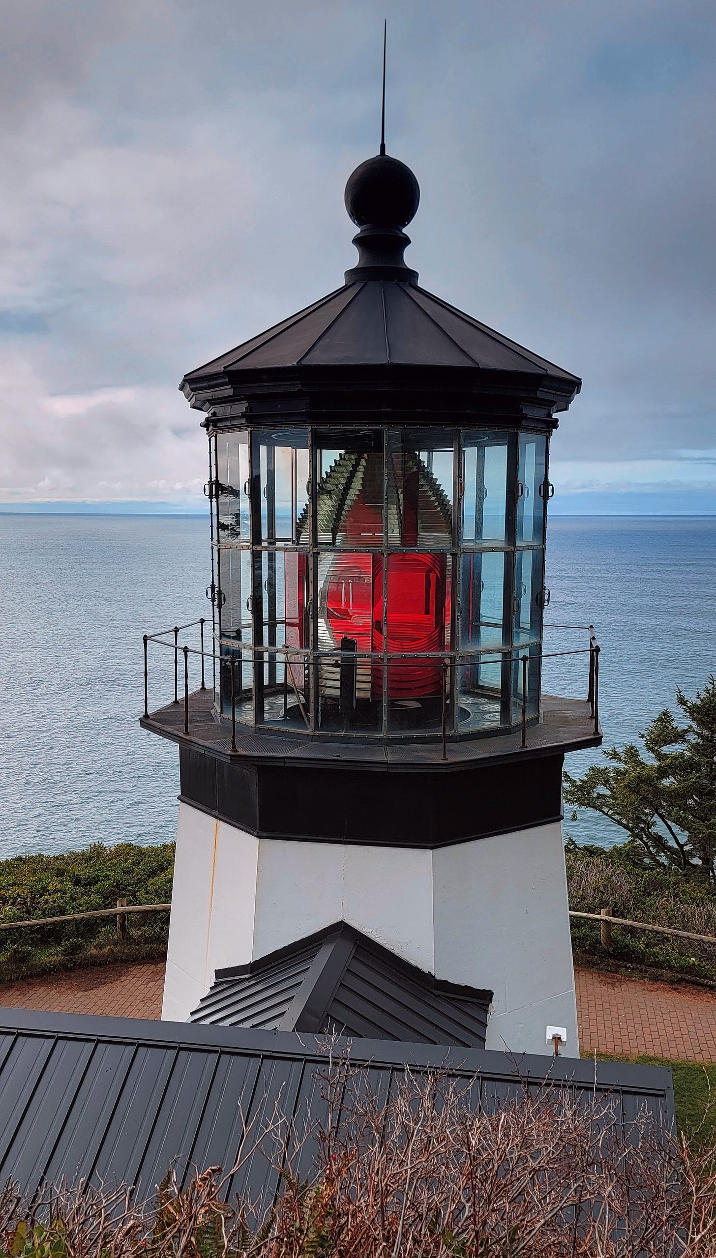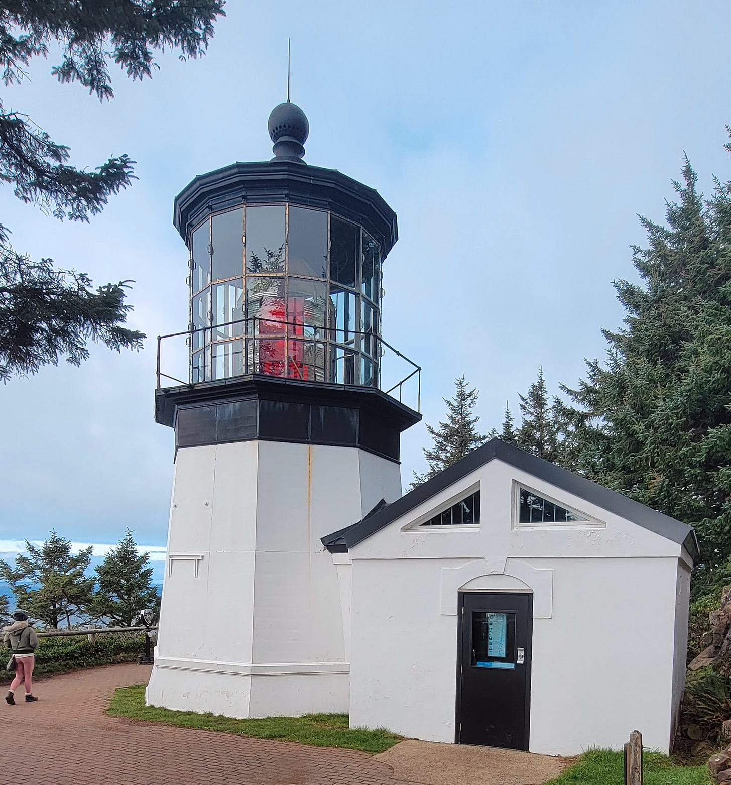 Once you get to the end of the path you come out right at the top of the Cape Meares Lighthouse and have the rare opportunity to be at eye level to the Fresnel lenses at the top due to the fact that while this lighthouse stands 217 feet above sea level the height of the lighthouse itself is only 38 feet from the ground it stands on, the shortest on the Oregon Coast.
