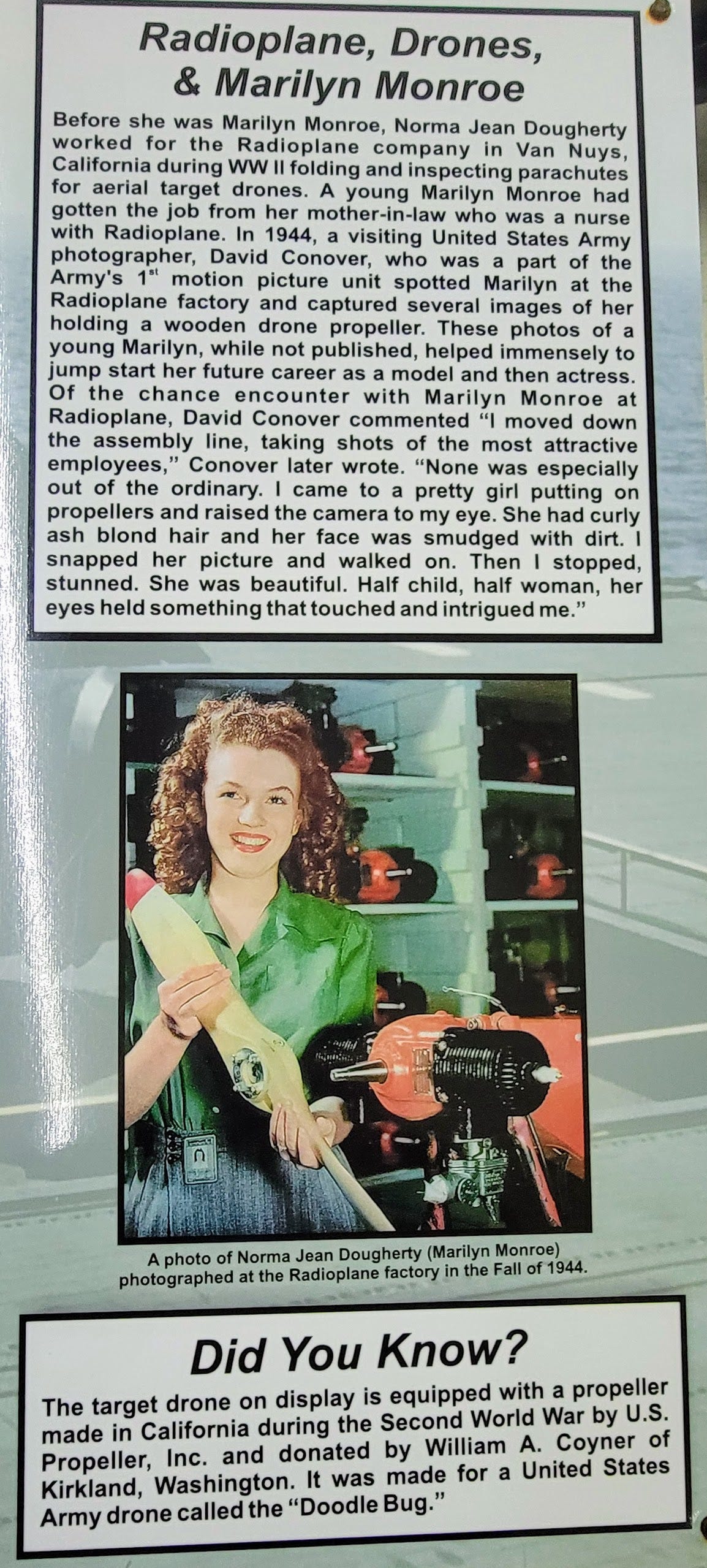 As interesting as that is the fact that Norma Jean Dougherty (AKA Marilyn Monroe) was working in the Radioplane Drone Factory in Van Nuys, CA when she was discovered by an Army photographer, and the rest is history….