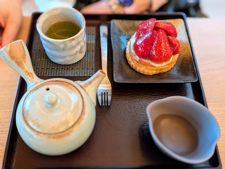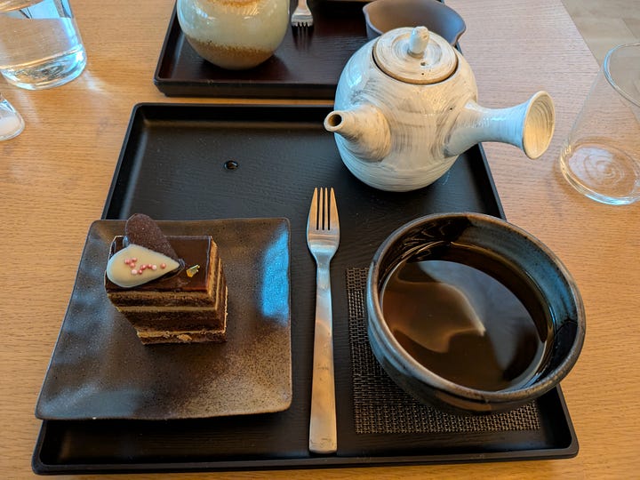 We sat together afterward inside the café and ordered tea and pastries. I chose the Hojicha paired with an Opera Cake. The roasted green tea carried deep, malty caramel notes, and the layered cake of biscuit joconde, coffee buttercream, and chocolate ganache was rich without being overwhelming.