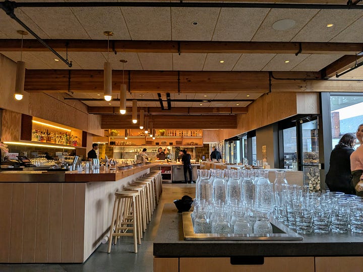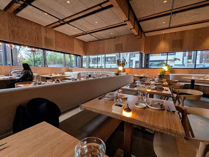 From there we made the short eight-minute drive to Takibi for their Valentine’s Winter Omakase menu. Takibi’s name references the Japanese word for bonfire, and the warmth of the space lives up to it. We paired the experience with a sake sampler for me and a mocktail sampler for Kay.