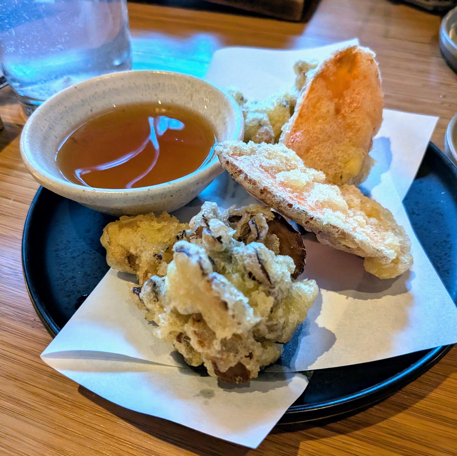 A harvest vegetable tempura followed, sweet potato slices and maitake mushrooms fried lightly and precisely. Crisp exterior, tender interior, no heaviness or greasiness.