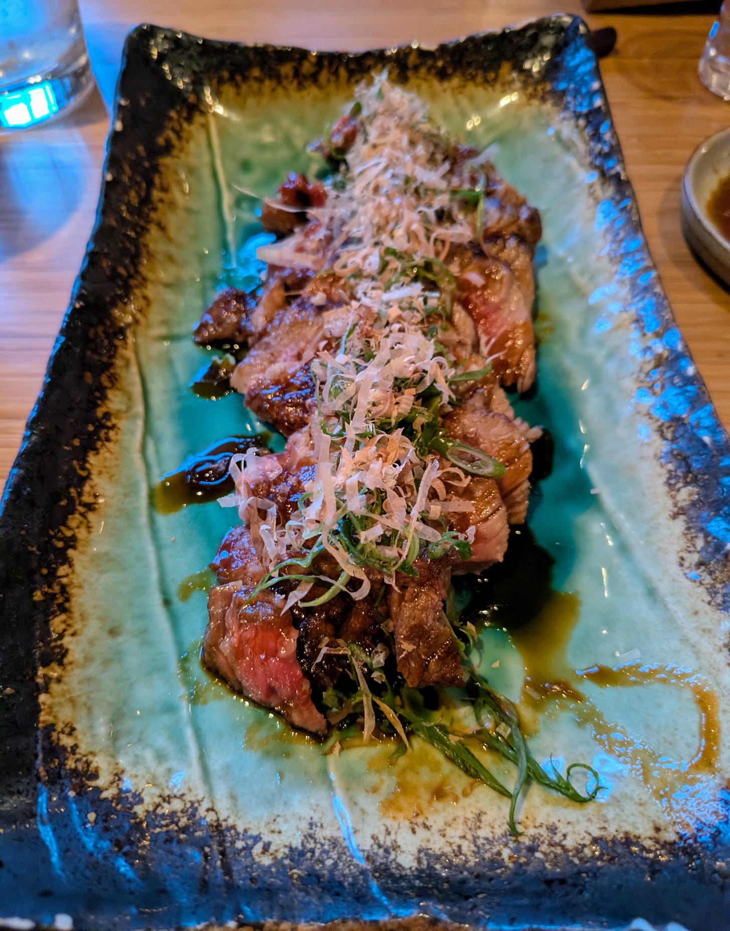 We added the optional grilled eight-ounce ribeye topped with shredded bonito, marinated overnight and impossibly tender.
