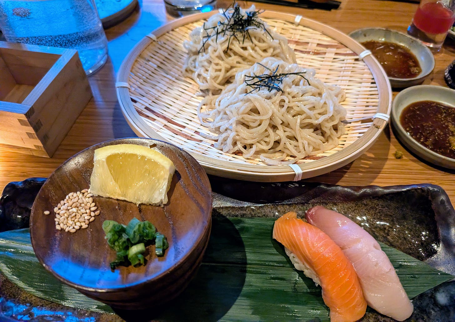 The final savory course brought chilled ramen broth with snow-aged wheat soba noodles alongside salmon and Hamachi nigiri selected by the chef. The broth carried a subtle smokiness that complemented the slight chew of the noodles, ending the savory progression on a thoughtful note.
