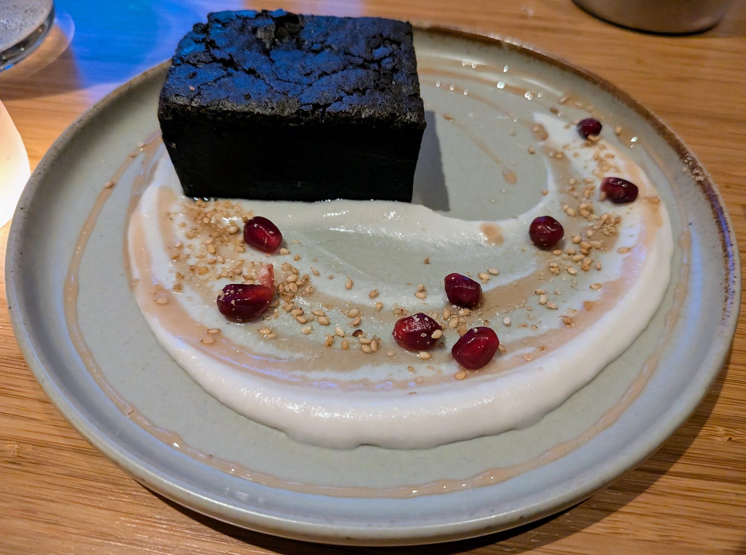 Dessert sealed the evening. A chocolate mochi cake resting on coconut cream and topped with pomegranate and sesame seeds. Part brownie, part mochi, entirely memorable.