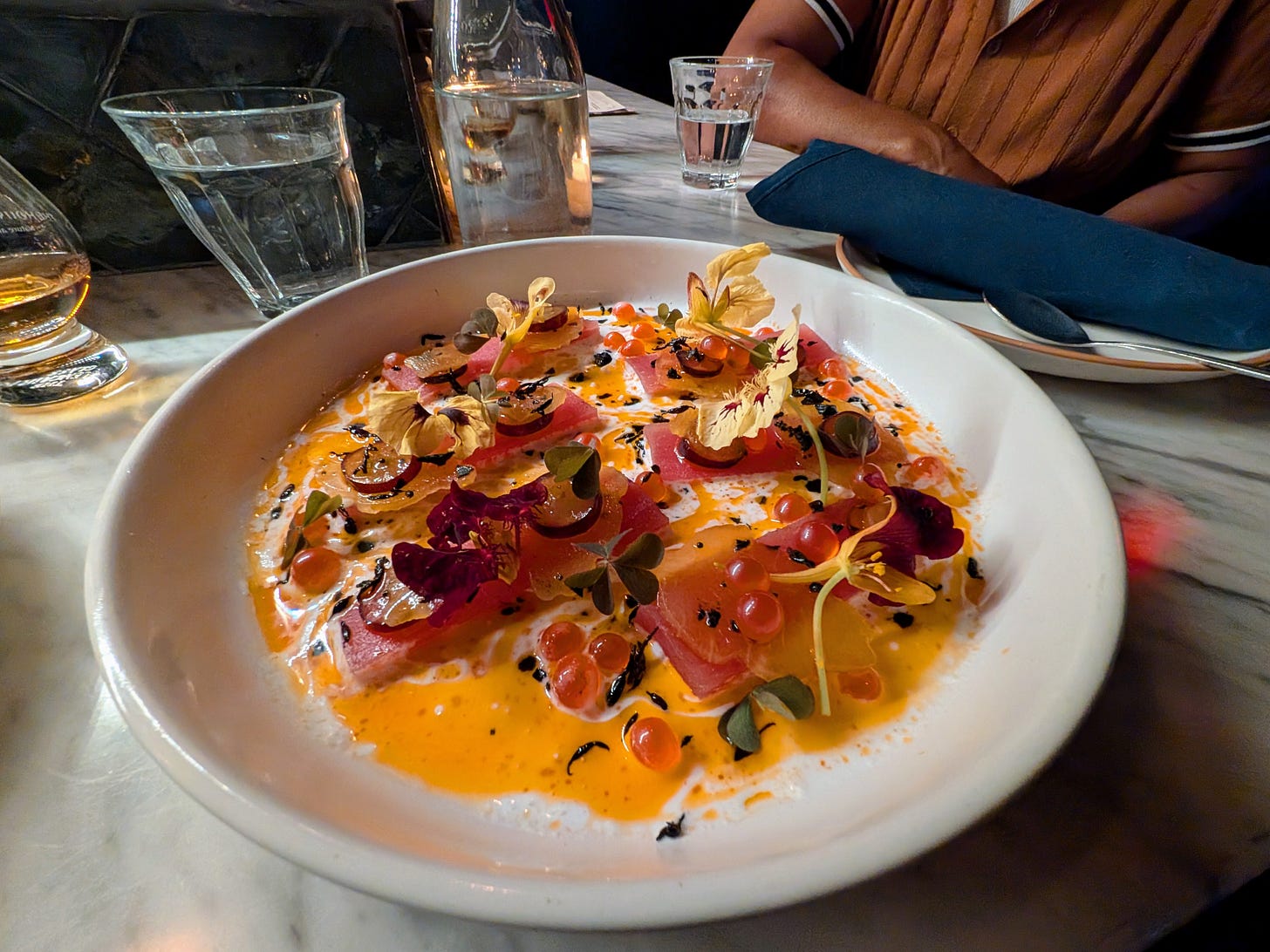 We snagged a spot at the chef's counter and started with the menus. The highlight for me was a dish of albacore crudo. The fish was delicate, fresh, and what made it truly special were the unexpected, fruity boba pearls that popped in my mouth, creating a fantastic contrast to the spicy sauce underneath. It was a dish I won't soon forget.