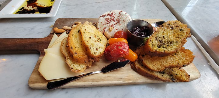 The restaurant is in an old building and still has some of the building’s distinctive features, but the inside decor is I would say, non-descript, characterless and lifeless. The physical bar itself though is pretty cool, but despite its size it still seems rather small and out-of-place for the space. I wasn’t there for decor though, so I started out with the Mozzarella Board - a sampler of fresh House-made marinated mozzarella, smoked mozzarella, burrata, roasted tomatoes, mixed nuts, basil oil, & a balsamic reduction served with herb buttered crostini all for $20. It was very good, rich and a nice start to the meal while I was waiting for the entree. It was also a sizable portion, and I was only able to finish about half of it.
