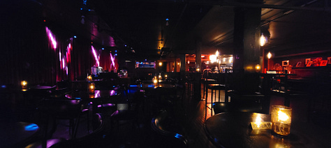 I was the first patron to arrive, so I bellied up to the bar, got Duane to make me a double vodka tonic with a locally produced vodka and had my pick of the place. I had reserved a 2-person table (the minimum) ahead of time and picked out a seat in the front and center. You can see looking back into the room in this middle shot that it is a very dark and moody space, absolutely perfect for some late-night jazz.