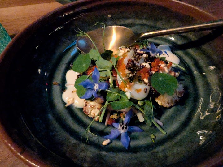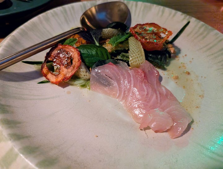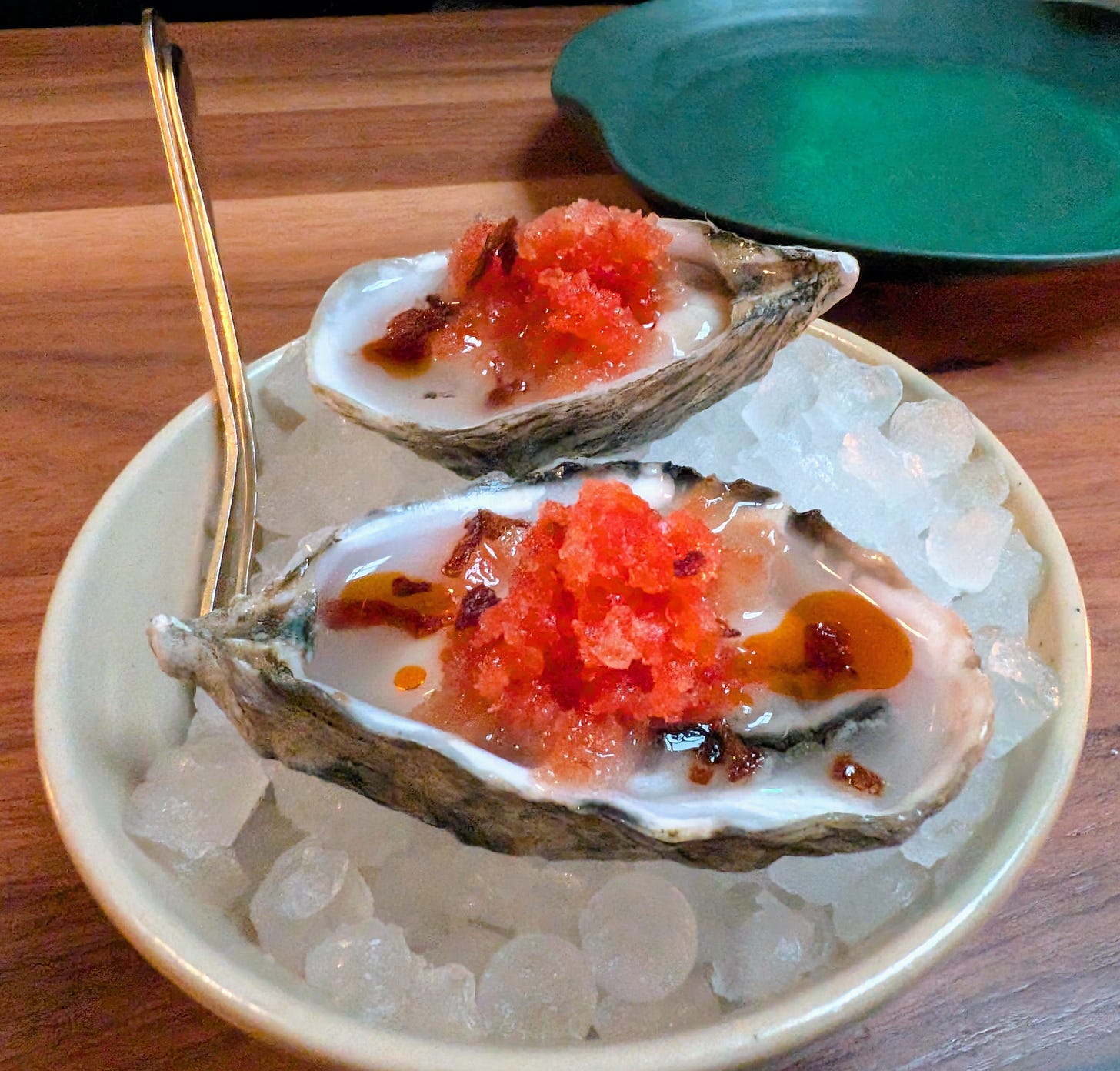In addition to the tasting menu, they offered a specials menu featuring an oyster appetizer with a mignonette, which I ordered for Kay (as many readers know, I'm not particularly fond of seafood with a strong oceanic flavor). Reviewing the online menu, I had hoped there would be enough other dishes to appeal to my palate… unfortunately, I was mistaken.