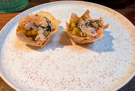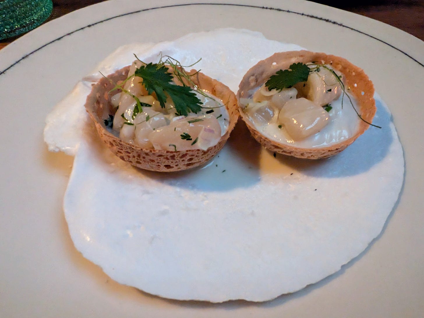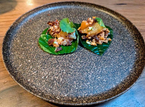 Regrettably, the majority of these dishes were not to my liking. The flavor combinations often felt disjointed, and many dishes leaned heavily towards excessive acidity. The notable exception was the Kanom Krok, featuring delicate Hokkaido scallops, creamy coconut, and fragrant Thai herbs, all served in a delightful crispy rice cup. The combination of the scallop's silkiness with the satisfying crunch of the rice, the richness of the coconut cream, and the bright herbal notes created a truly memorable bite. Sadly, this was the only enjoyable dish on the entire menu for me.